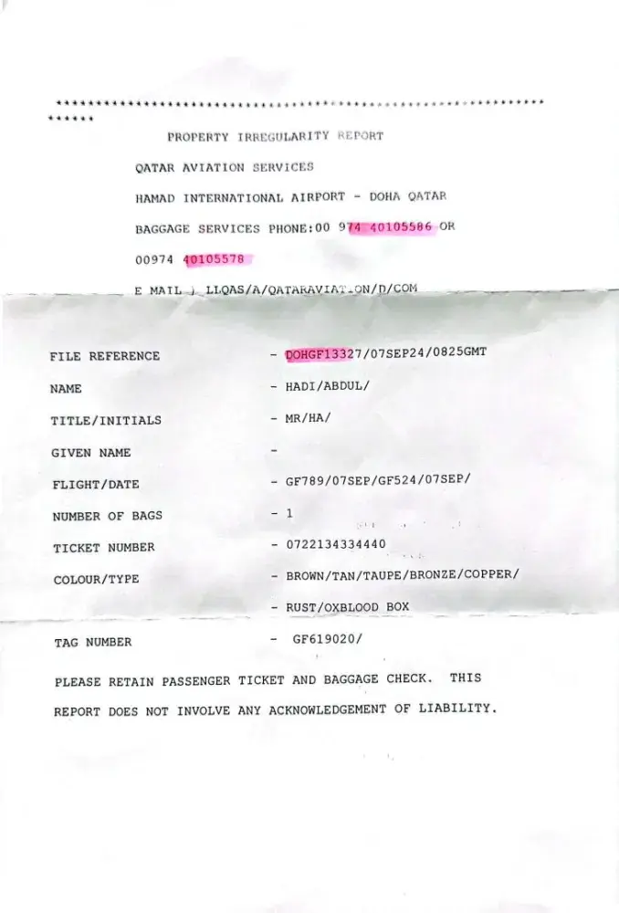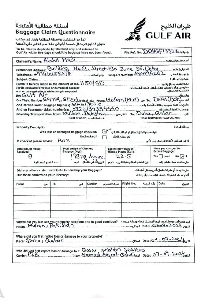 I am inquiring about my lost baggage which was lost on 7th September 2024. i was yravelling from multan to doha. I reported at hamad international airport and received file reference number:DOHGF13327