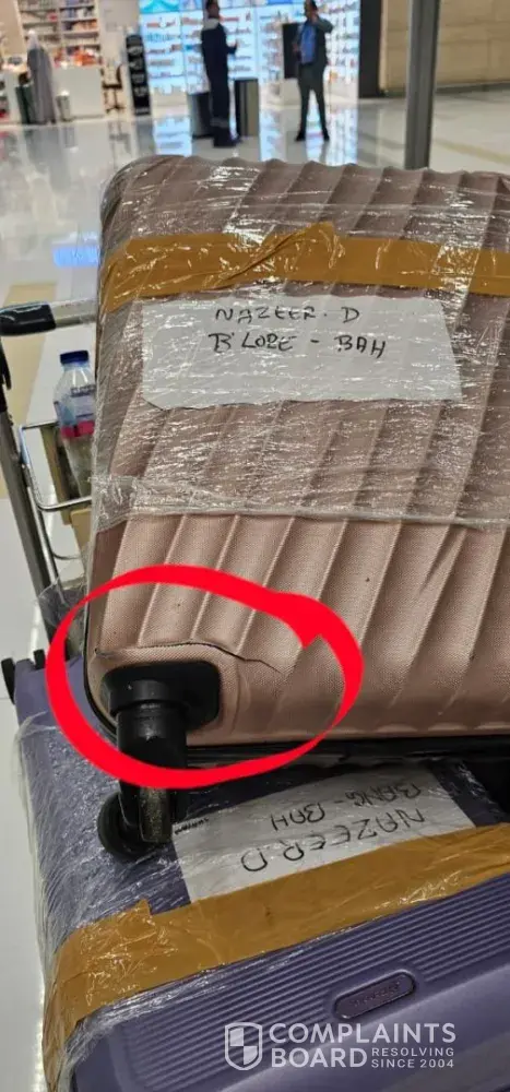 Nazeer derlakatte ticket no. 0722135355024 travel from Bengaluru to bahrain damaged when checked in bahraIn in baggage claim area. It was broken I have before and after pic my email I’d [protected]@gmail.Com I travelled from Bangalore to Bahrain with my family. All my baggagees were in a good condition. But when i went to take my baggage from the claiming...