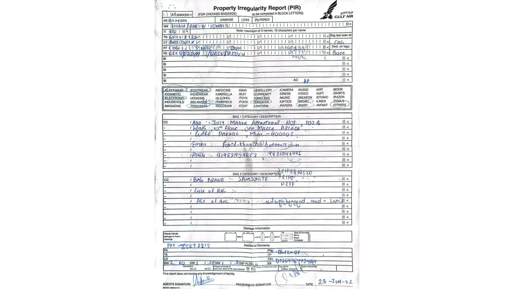 Based on 2 evidence passenger Ramos Mari filled the complaint with the agent of Gulf air (King fahad Intl apt), which issued PIR to the passenger.