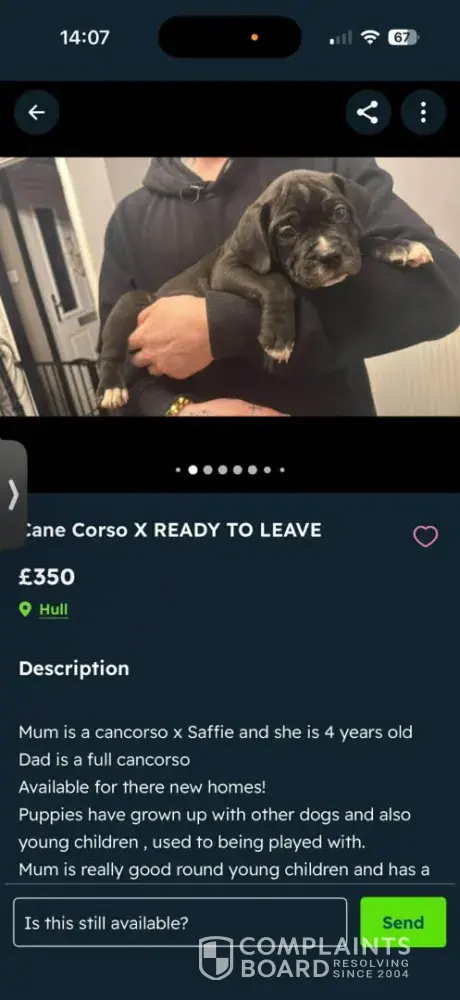 The breeders advert was published and it was saying that the pups have been microchipped which they haven’t! I managed to screenshot the ad but not the part where it says they have been microchipped I’m afraid the breeder sold us a sick puppy claiming to be healthy ! The pup came with no paperwork! Breeder haven’t showed us the parents neither. I have...