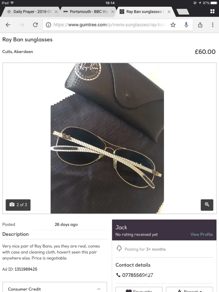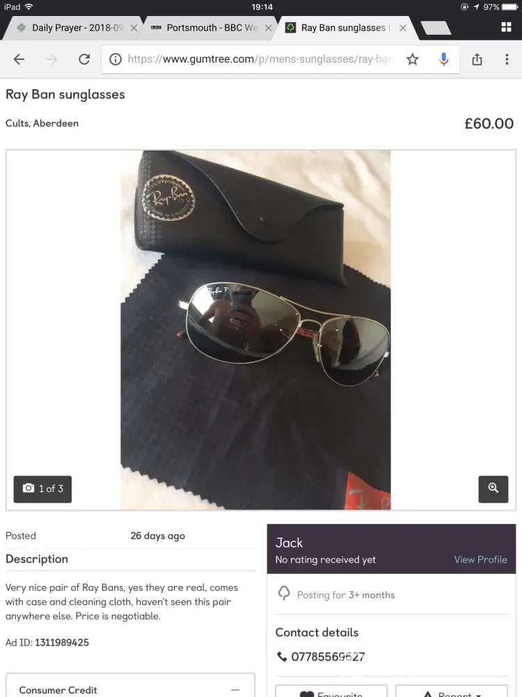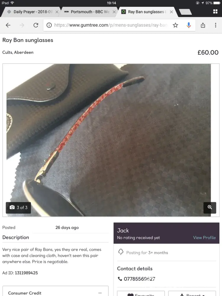 I purchased a pair of ray ban sunglasses from jack d odlin (ad id [protected]) who resides in cults, aberdeen, for £43.50. (inclusive of postage) on 15 september and paid by online bank transfer to his bank (sort code 80-45-86, acc no [protected]).