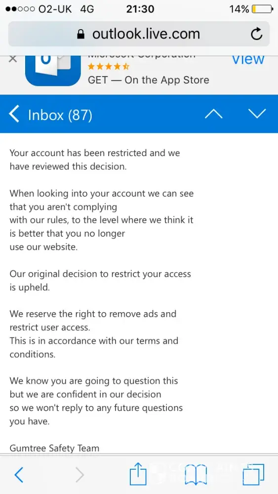 Gumtree are refusing to answer any further queries from myself as to why and how I have broken their rules and regulations leaving me very upset at being accused of something I haven't done. The only suggestion I have is that my account has been misused by hackers? Please could you investigate the above on my behalf and advise me how this issue can be resolved as I feel deeply saddened by the accusation and decision of banning me from Gumtree.