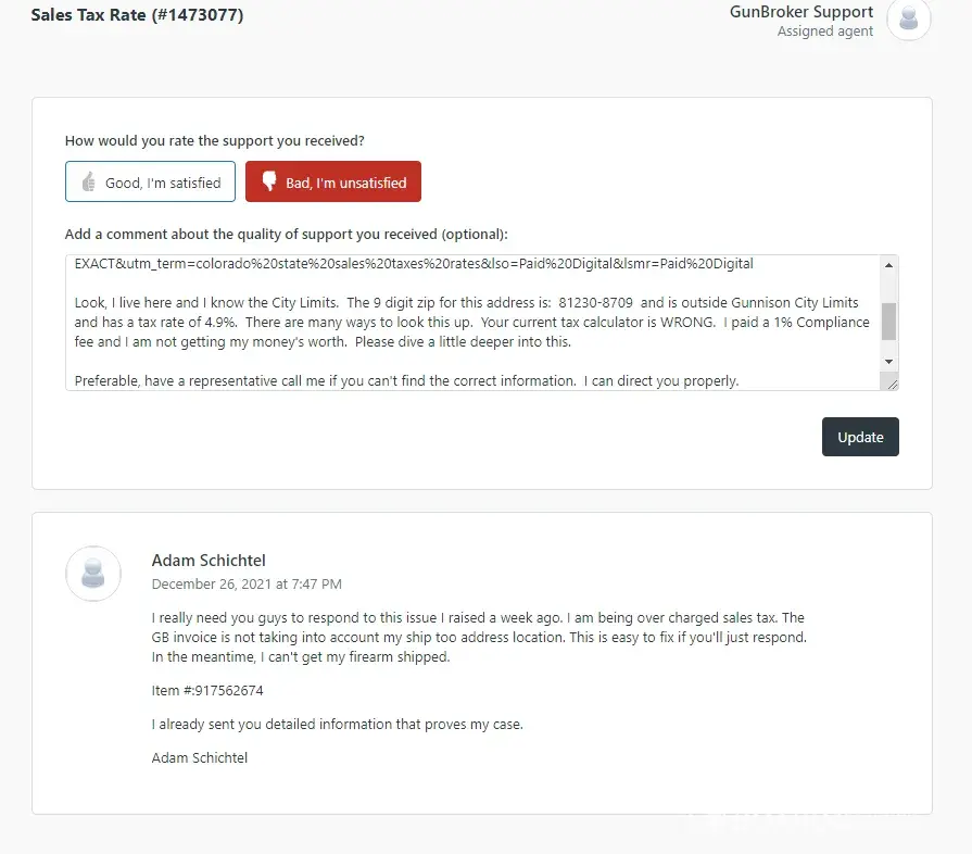 GunBroker overcharged me for sales tax based on the ship to address and refuses to even acknowledge my complaint despite my providing proof.