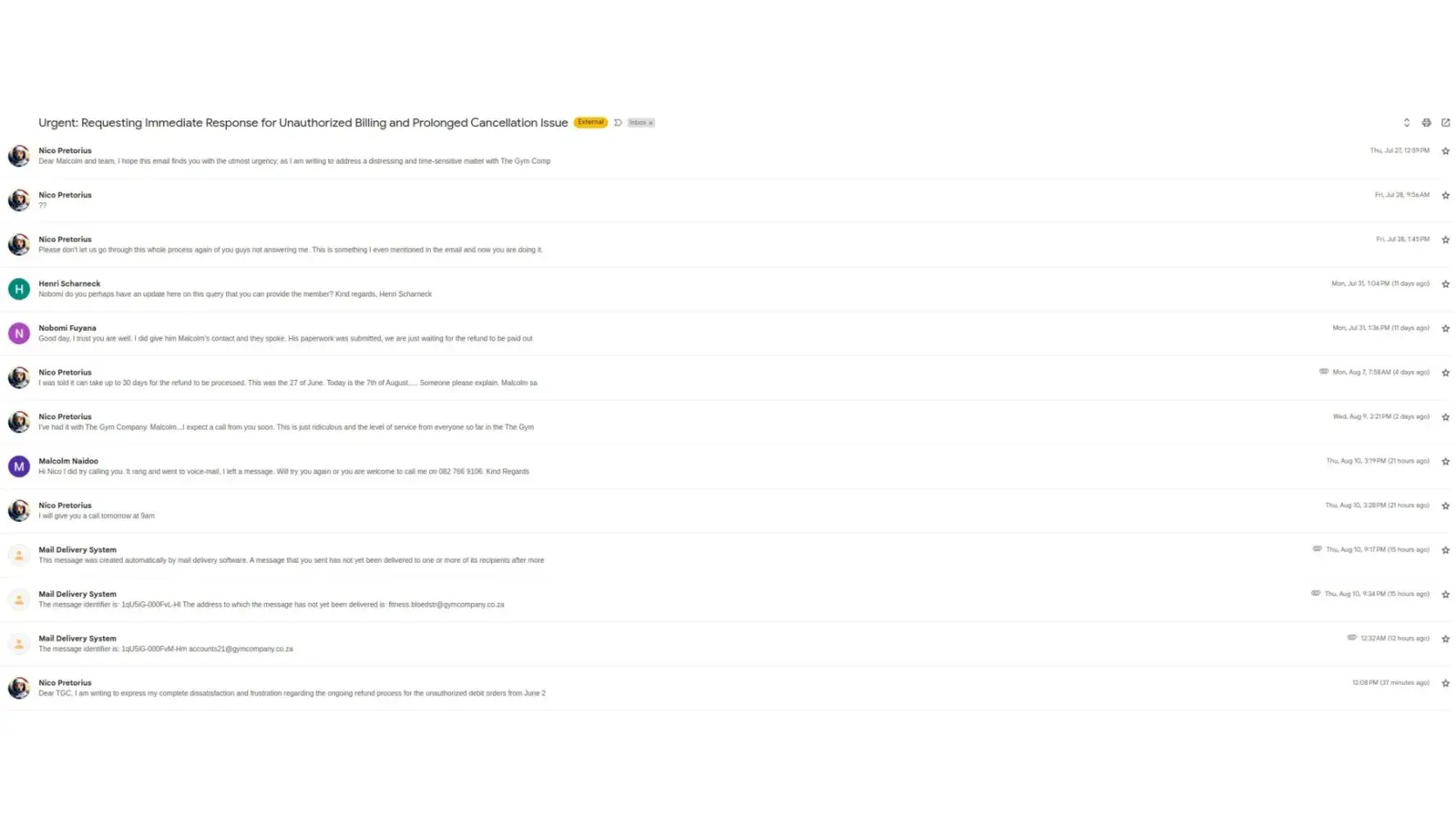 I am writing to formally lodge a complaint against The Gym Company in connection with a series of unauthorized debit orders that were deducted from my bank account on June 25th. Despite my persistent efforts to resolve this matter directly with the company for the past 40 days, I have encountered a lack of responsiveness, competence, and accountability.
