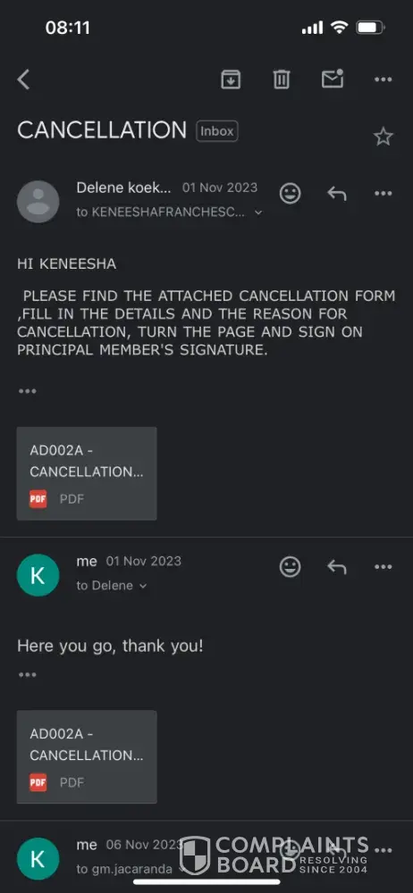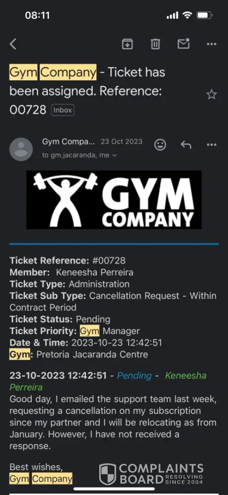 In October 2023, I decided to cancel my membership as well as my partners membership which are conjoined. According to the contract I signed, you need to give 3 months notice before termination. I emailed gym company, they emailed the documentation, I filled it in and all was good. End of December 2023, I contacted them to find out if it has been cancelled, to my surprise it was never cancelled and I was told to wait until the 8th or 15th of Jan to speak to the admin staff. I then waited, contacted them and they asked for the documents once again. I submitted it, this time, face to face at the Jacaranda branch. Today (24 Jan 2024) I contacted them and it’s still not cancelled.