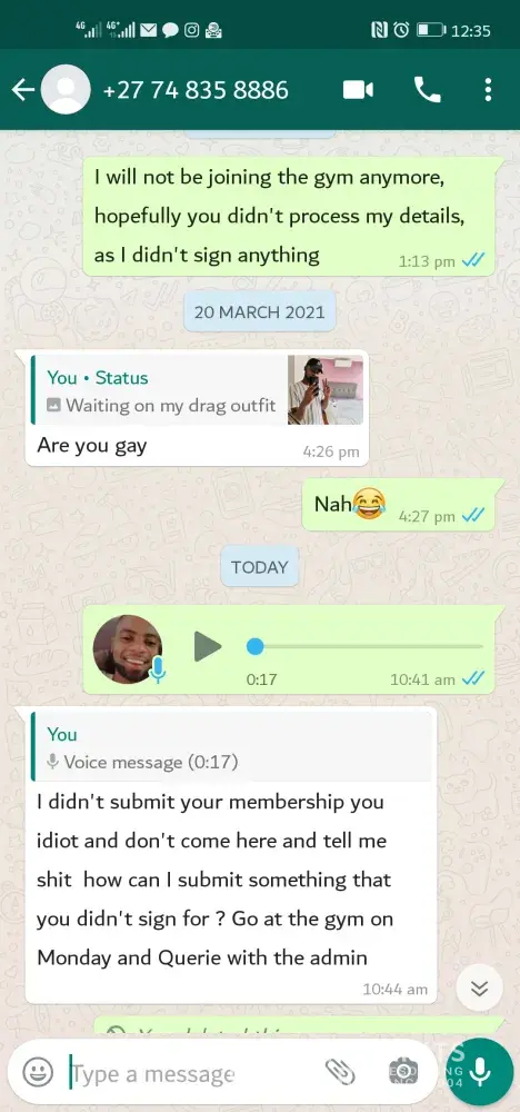 Hi, approximately two months ago, a lady approached me about a gym membership, I asked him how much it will cost, she told me it will cost 200 Rand a month but the first month is 100 bucks, she took down my details bank account and everything claiming to be running checks, I didn't sign a contract nor did I go to the gym facility a day or two later, I call her back and tell her I won't be signing up, two months later 300 bucks gets debited from my account from gym company, I text the lady as I still had her number and ask about it, she called me an idiot and said I should go to the branch on Monday and quiry the matter. she goes by the name :Tumi