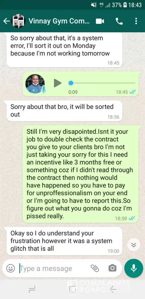 Good day my name is Lindokuhle Ayanda Cele with ID number [protected]. I rejoined Gym company (Arbour Crossing) on the day 03-Sept-2021. I joined to get a platinum membership and after all my details were taken I was made to sign a contract I didn't sign up for which is the black tag. I am highly disapointed by the customer service I got from Vinai Kumaran Naidoo who has been undermining my inteligence up to date by telling me I signed the wrong contract becuase of a system glitch. When he even gave me a copy of the contract he made me sign which clearly states something that we didn't agree on with him he was fully aware that I wanted a platinum membership and when I confronted him about it instead of apologizing for his mistake he just brushes me off by telling me to come in and further fix things with him on Monday of which that is my time that will be wasted again attending to something that should have been done by someone who knows what he/she is doing. Please may I get positive feedback as to the steps that will be taken in rectifying this mistake or else I will go back to my previous gym becuase of the unsatisfactory customer service from the gym company employee who was assisting me with signing up namely Vinai Kumaran Naidoo. I have attached my conversation with Vinai of him denying that he made a mistake.
