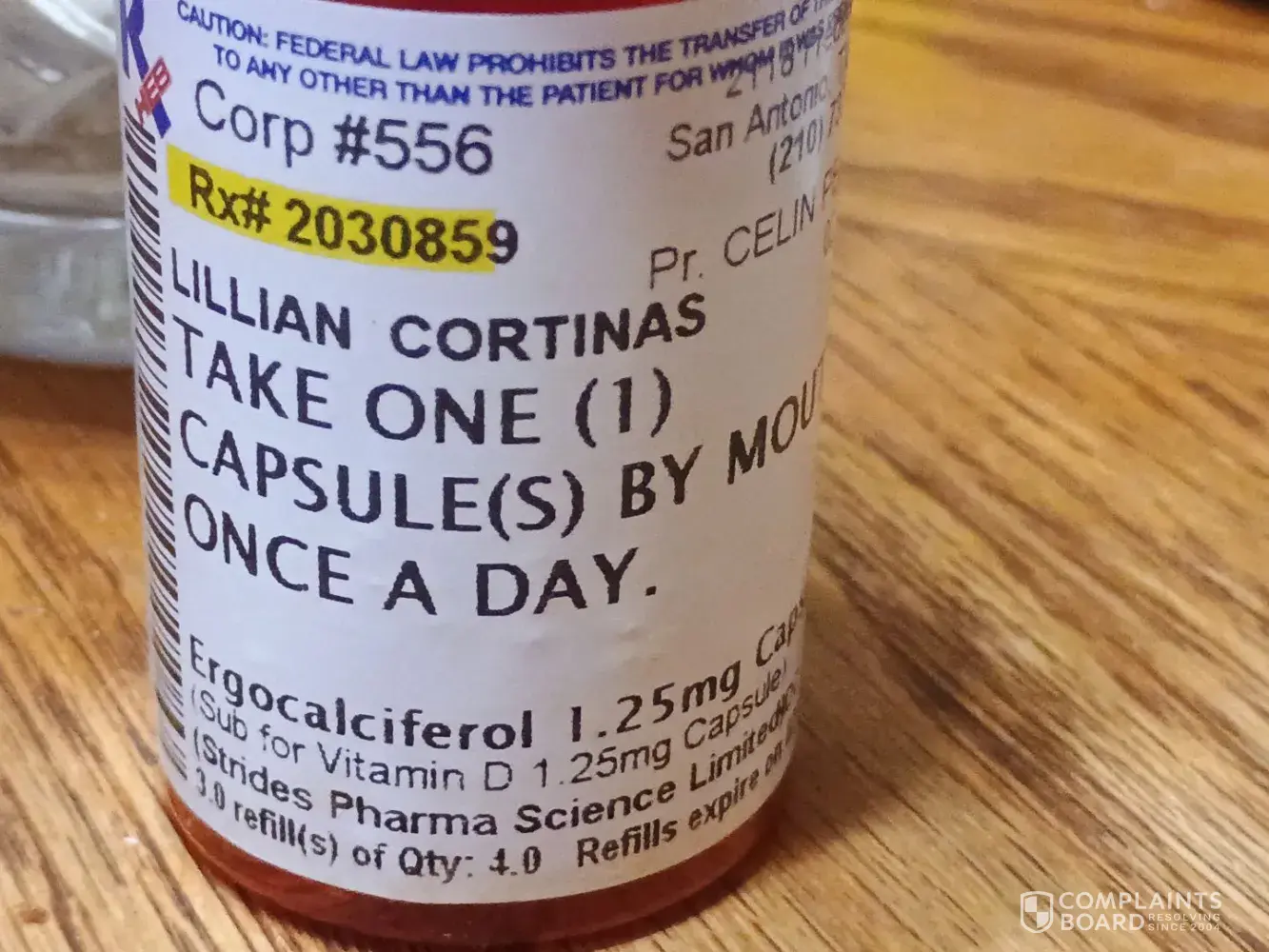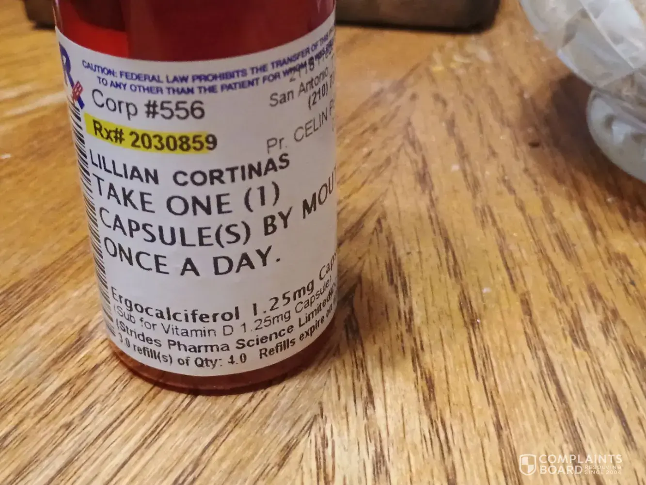 Pharmacist Joshua located at the Fredericksburg road # 556 gave me the wrong information on the bottle of prescribed for vitamin D e r g o c a l c i f e r o l 1.25 mg to take capsule by mouth once a day when my doctor prescribed the vitamin to be one capsule once a week. This cost an overdose of vitamin D causing blood work to be done due to pains in my...
