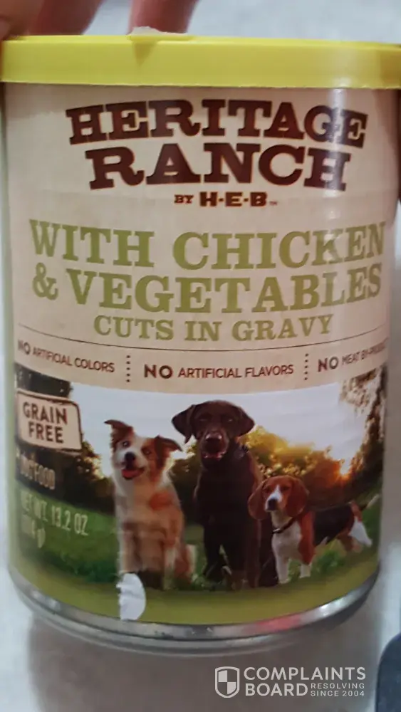 I purchased a 12 pack case of the HEB dog food and today in opening one of the cans found a piece of plastic in the food. Our dog has been ill for the past 3 months throwing up and has been to the vet twice for x-rays and put on medication for nausea. He has been eating this food for the same amount of time. Now I know why! I opened this can and put it into his bowl and because I had to add medication I was stirring the bowl and found this in the can.