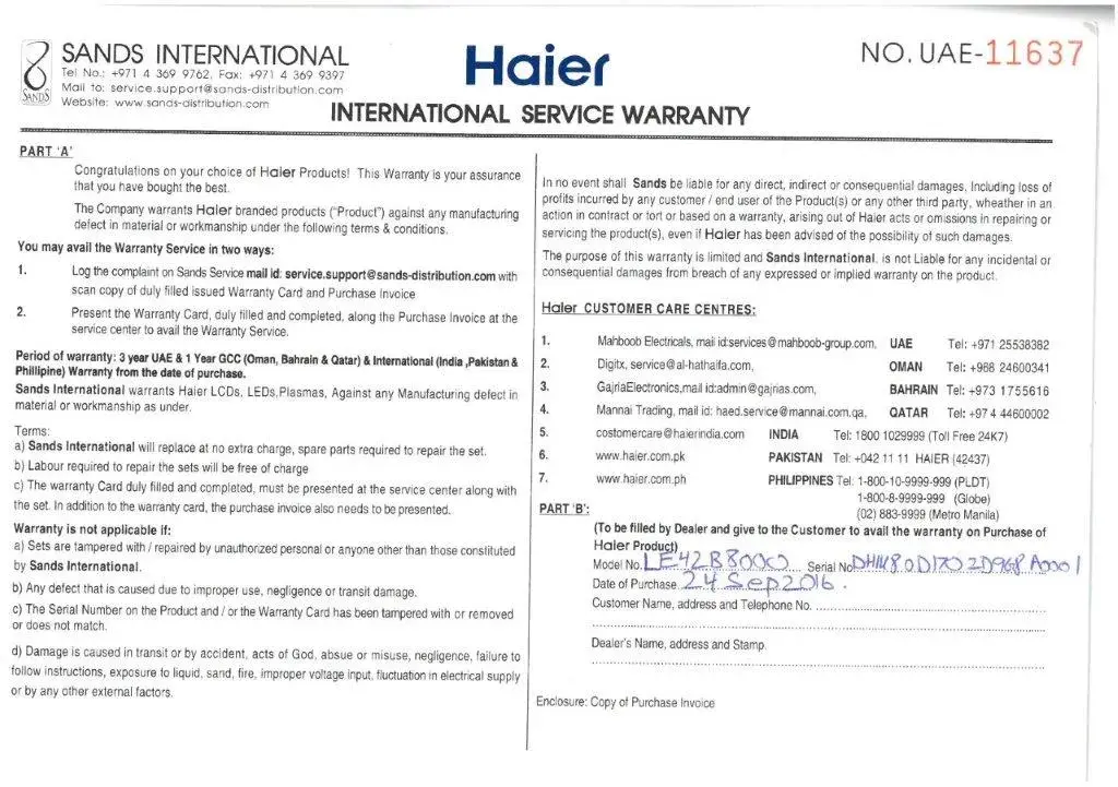 Tv not working informed within warrenty period, promised to repair, then replied willbe refunded ...later no reply at all to telephone calls. The final contact and Name for the Haier Tv authority in Dubai : LANEESH KUMAR [protected] / laneeshv@gmail.com