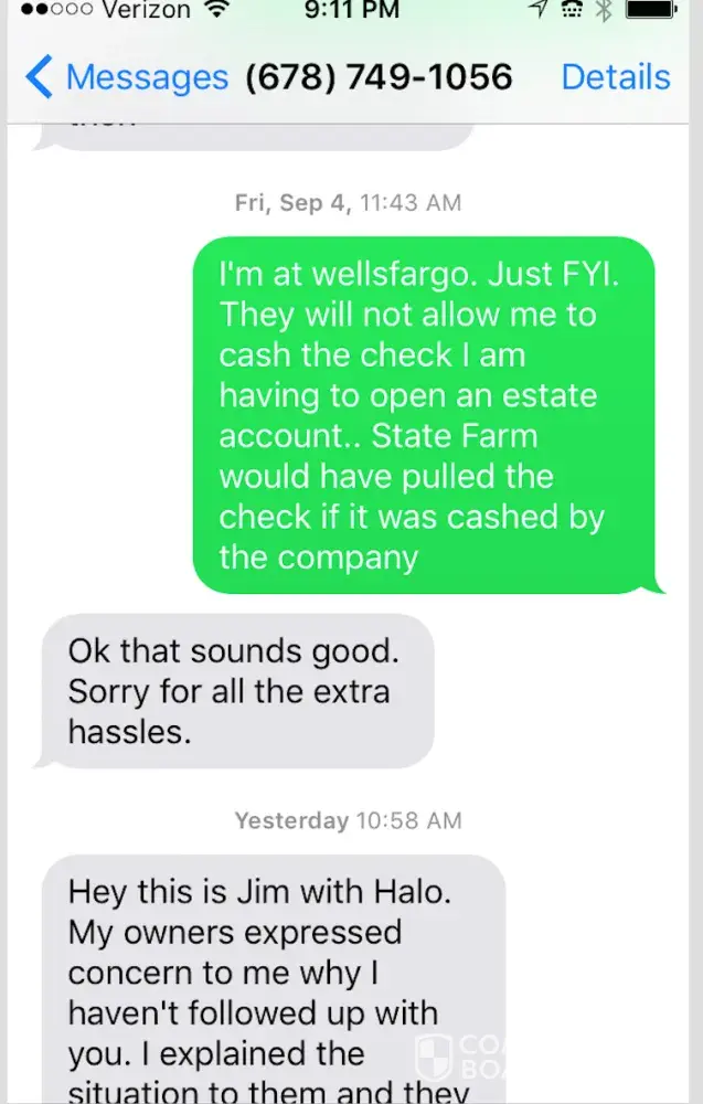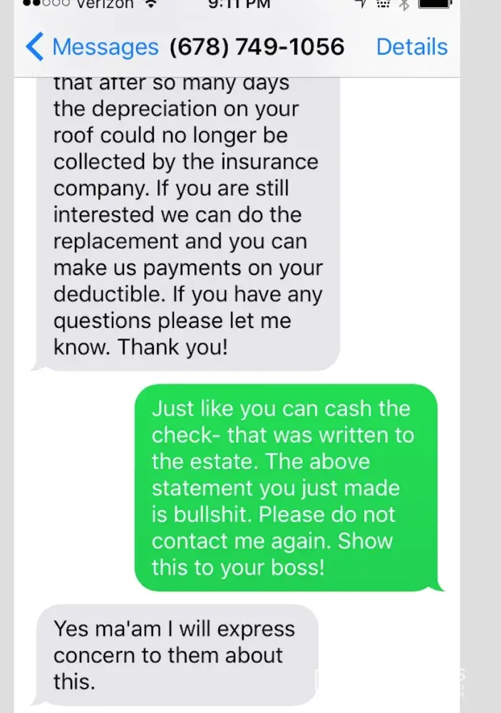 Jeremiah Edelen who claims to be a public adjuster for Halo construction, has been giving me false information as well as harassing me by phone as well as text messages. I had asked for no contact from him or his company after he stated that he could "push an insurance check through" when the check was not made out to me, but was made out to the Estate Of. When I contacted my bank as well as State Farm they informed me that I would need to open an estate account in order to write a check to pay for the roof repair. I felt uncomfortable with moving forward with Halo, Tim Greene and Jeremiah Edelen. A few days later I received a text from their sales man stating "If I did not put my roof on in a few days, I would not get my depreciation check from State Farm. I contacted State Farm again and was told that was untrue. I emailed Tim Greene explaining to him I wanted no further contact from him or anyone from Halo. Within 15 minutes I had 3 phone calls and 2 voicemails from Jeremiah. The messages state that I am committing insurance fraud and that he will be filing a lawsuit against me for defamation. He also goes on about he is going to report me to my mortgage company about not fixing my roof and pocketing the money. I emailed him again explaining that I had called the police and would be filing a harassment complaint, which I did. The officer from Lumpkin County had a phone conversation with Jeremiah telling him not to contact me again in any form. I had no contract with Halo and I had decided after the misinformation about the check, to move forward with a different Roofing Company.
