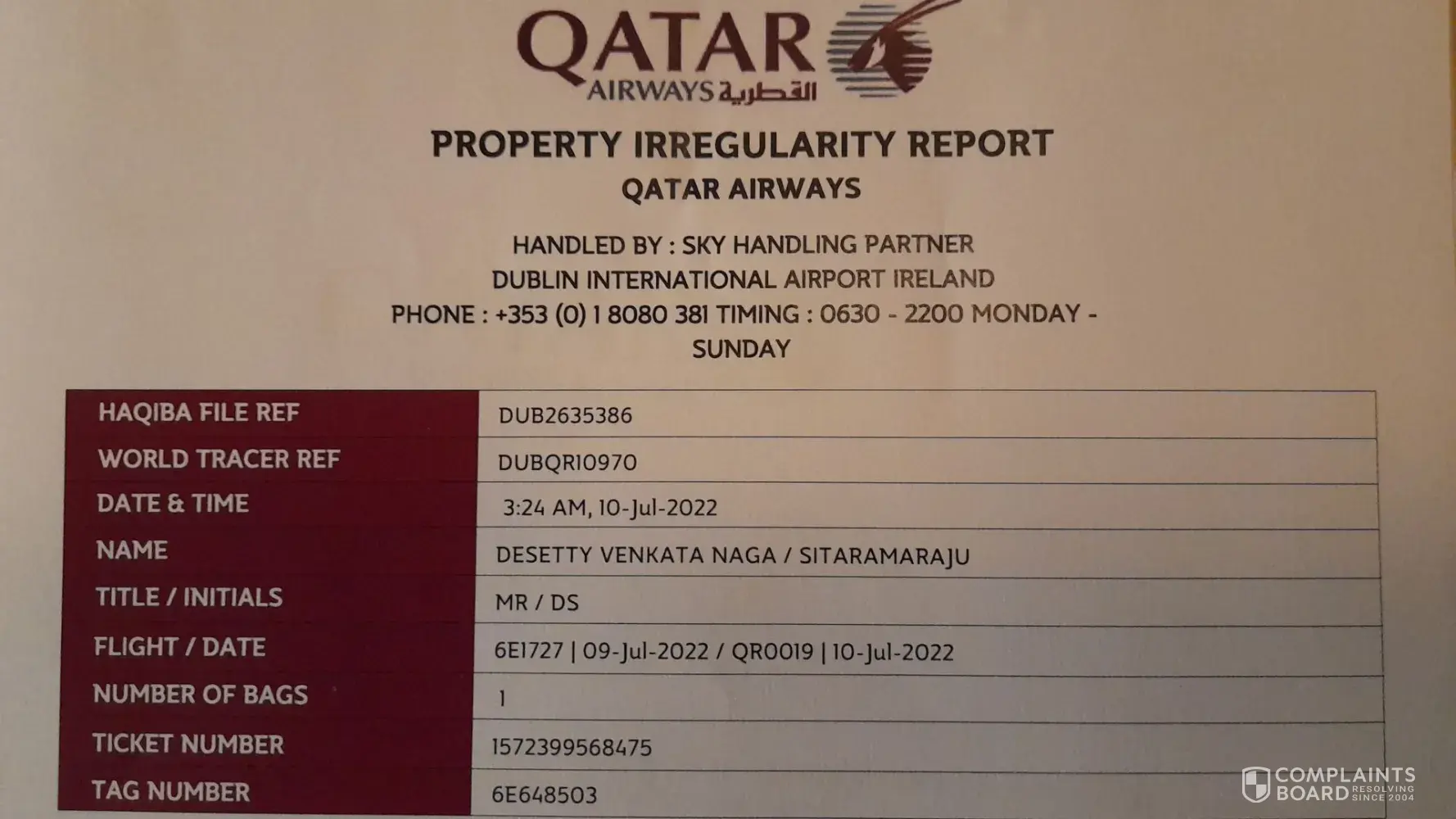 9th July'22, booking reference LS9MRN, Qatar Airways: Itenary: Hyderabad - Doha - Dublin. Baggage 6E648503 is not loaded into flight to Dublin Qatar Airways unable to support. Baggage: Safari brand, wine red color, 157cm, approx 22kgs. 4 wheel retractable trolley suitcase. Please check if suitcase found with different tag, as the airline staff in Hyderabad wrongly printed the tags to Doha instead of Dublin.
