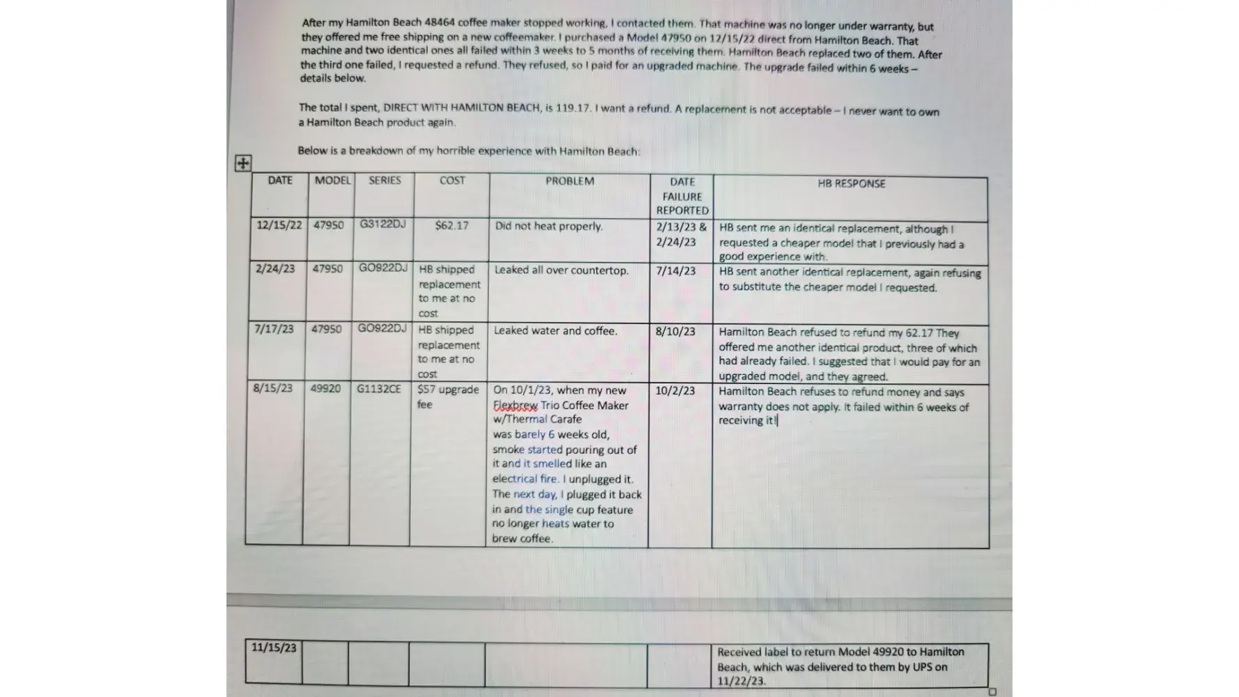 Since 12.22.22, I have purchased 3 BrewStations Model 47950 and 1 Flexbrew Trio Model 49920 direct from Hamilton. All four coffeemakers failed in various ways (leaking, failure to heat properly, and burning up inside) within 3 weeks to 5 months after I received them. I spent a total of $119.17 direct with Hamilton Beach so I have not had the option of returning them to a retailer. Hamilton Beach refuses to refund my money, and after FOUR failures within 11 months I am unwilling to accept another appliance from them. I want a full refund.