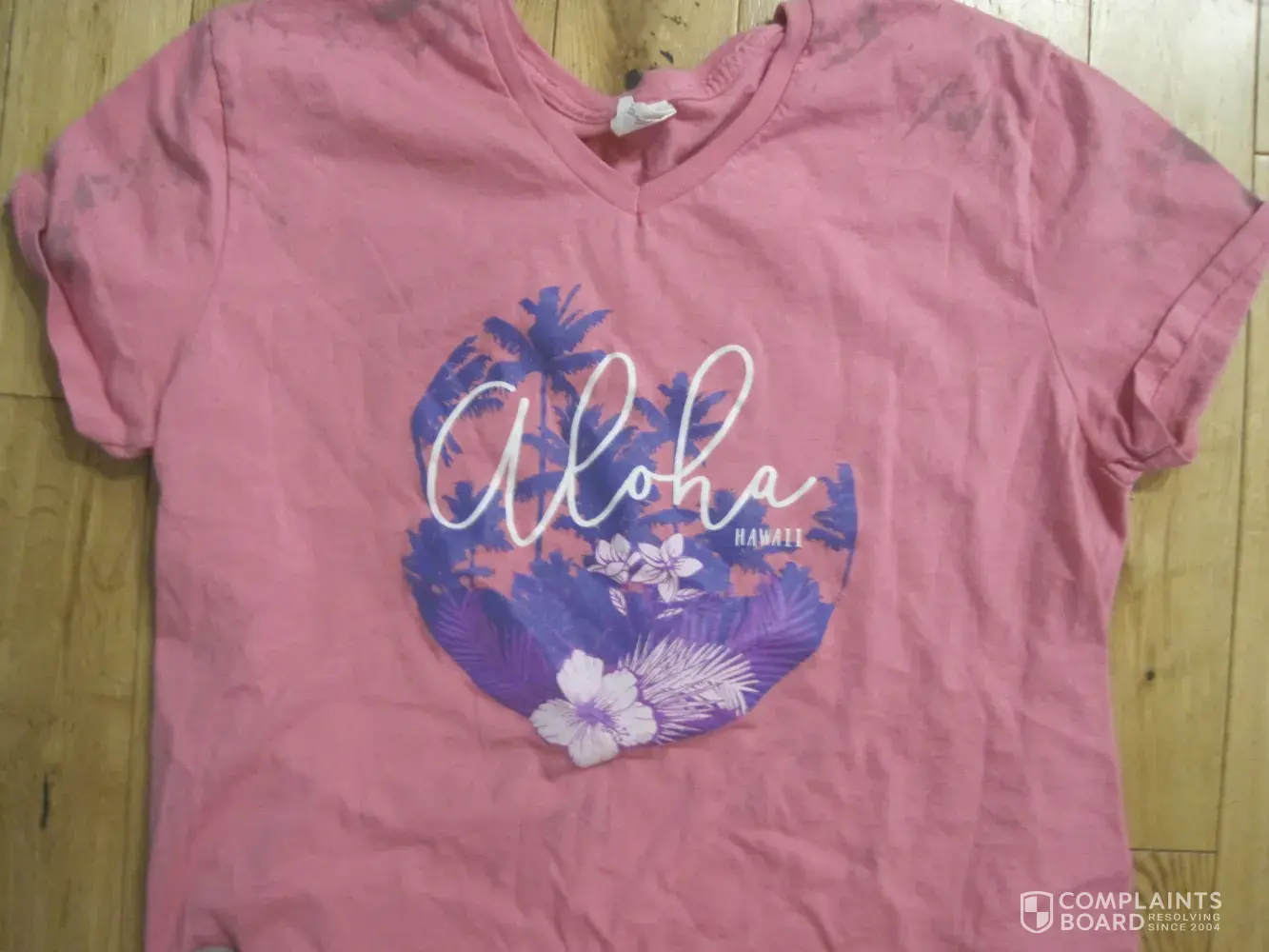 My wife and I recently were vacationing in Hawaii and went shopping at a Walmart store. There we purchased a Hanes pink t-shirt with an Aloha Hawaii logo on it. That t-shirt had purple palm trees in the background and was made in Hatti. When that shirt was washed with a colored shirt load it stained three other shirts with purple, as if the palm trees were an inked stamp. We tried but were unable to remove the stains from those golf shirts. They were three of my favorite shirts that I brought along on our vacation. There were not warnings to hand wash or wash this shirt alone. I have pictures of the Hanes shirt and the three shirts that were stained. We tried stain remover and multiple washes with no success. This t-shirt even stained itself (see some stains on picture on shoulder area).