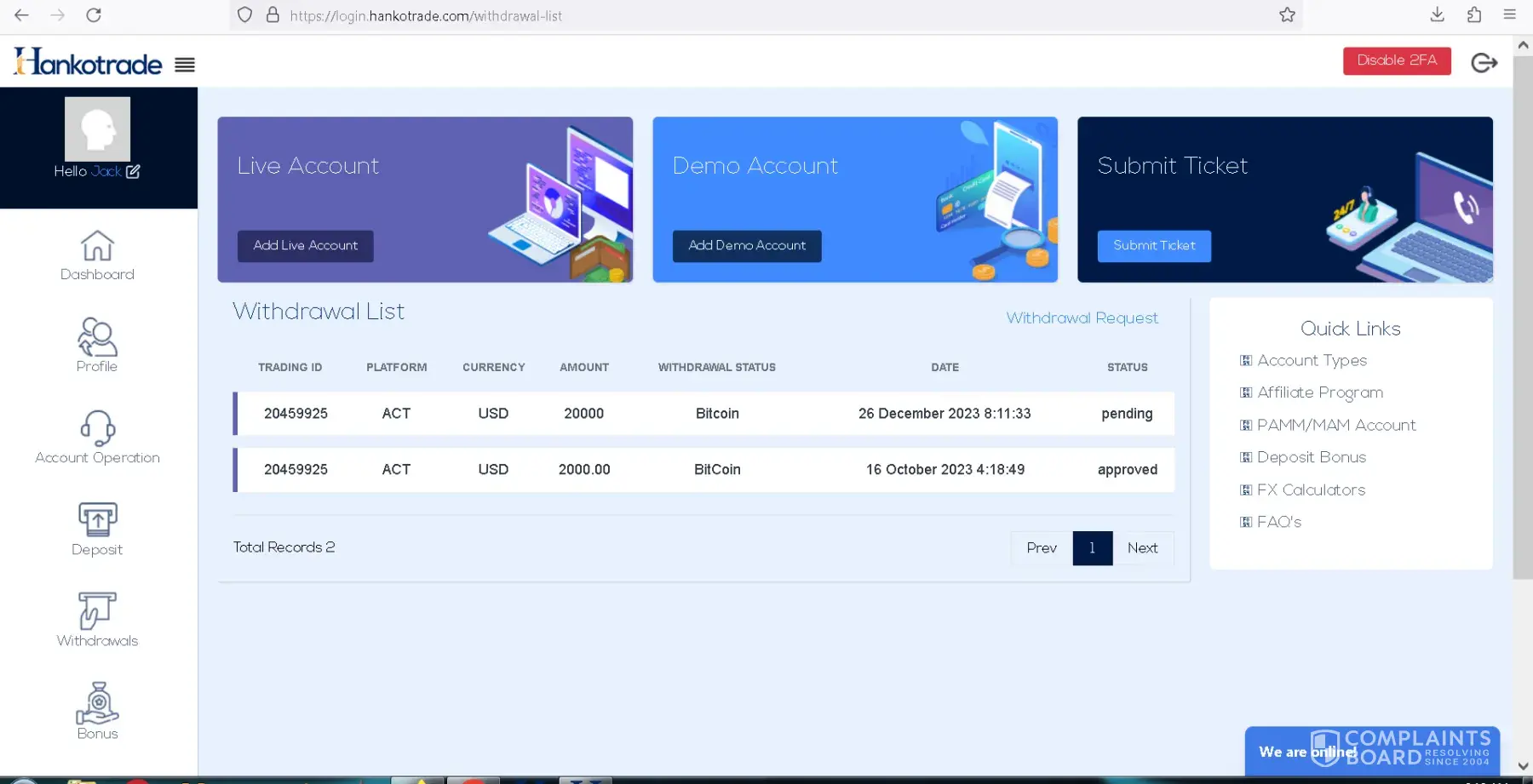 I placed a withdrawal request of 20,000 USD on Tuesday (28 December), and my withdrawal was delayed for 2 days without any explanation. The next day (Wednesday 28 Dec) I noticed that they had simply "DENIED" the withdrawal - still without ANY response from either of their 2 support email addresses ([protected]@hankotrade.com and [protected]@hankotrade.com...