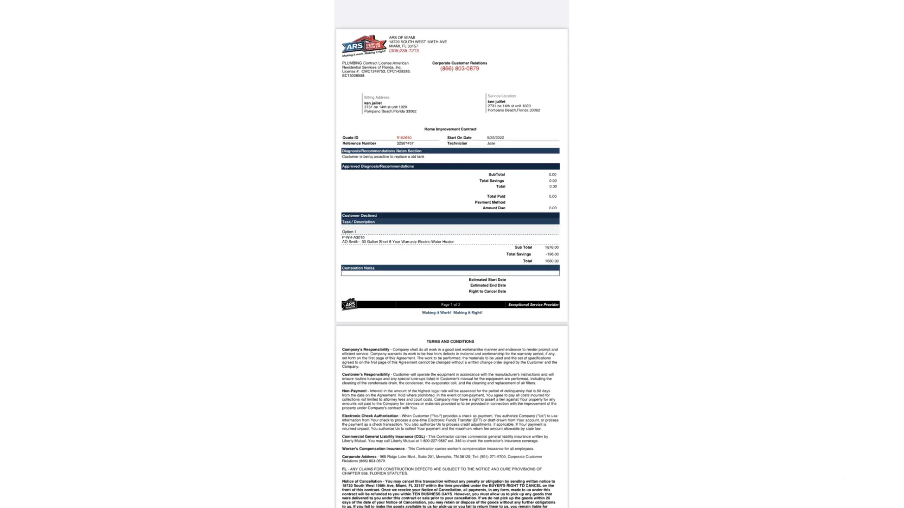 I purchased a hot water heater a 5/25/02 and due to a faulty installation by the Lowes Contractor ARS, my condo was flooded yesterday, and the entire unit needs to be remediated and the hot water heater installed correctly. This is the 2nd leak and other condos were also damaged by the water leak.