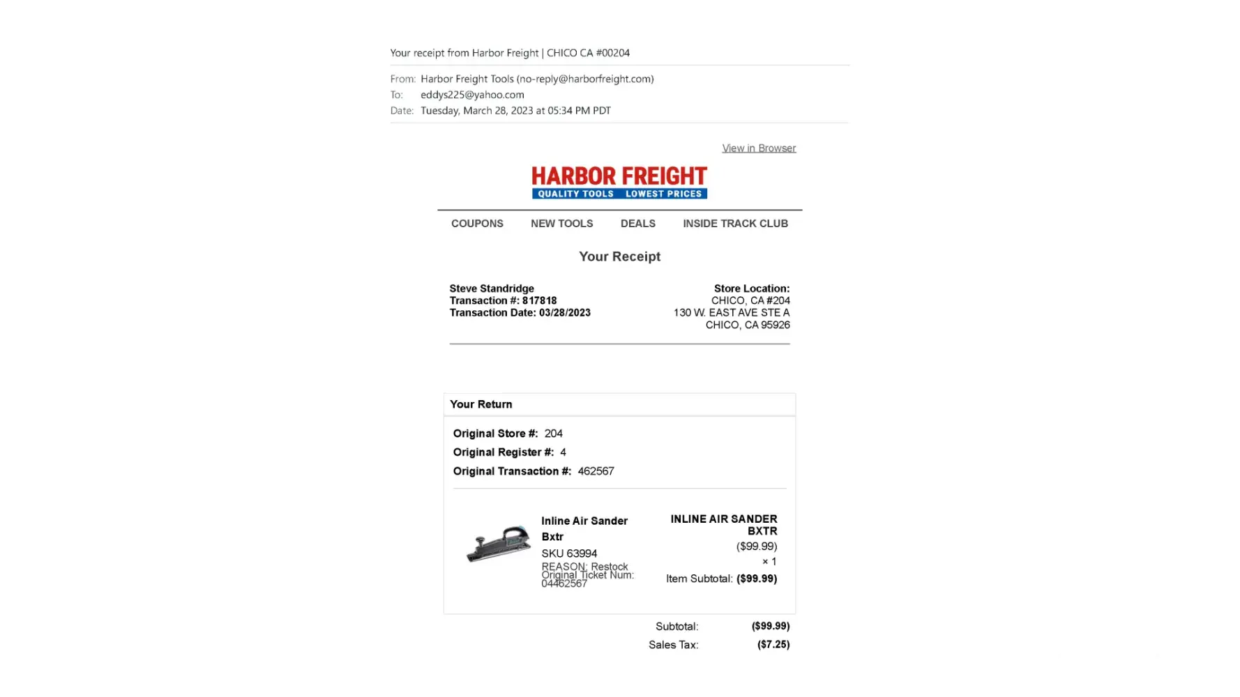 Several months ago, I purchased a straight line pneumatic sander. I had it for a few weeks before I used it and after using it for a couple of hours the sander stopped working. I went to the local Harbor Freight Store located on East Ave. in Chico Ca. and exchanged it for a new one. There was no indication that if I had a similar problem I would only receive store credit vs. getting my money back. After a few weeks I decided I did not want to chance it that the new would would not have the same issue as the first one I purchased. So, yesterday (3/29/2023) I returned the replacement sander, which I had not used nor did I open the box (it was sealed as it had been when I exchanged for it). I was told company policy is that I can not receive a money refund but was relegated to a store credit in the form of a gift card. I asked that had I returned the first one would I have received my money back I was told yes. I've been a loyal customer for over 25 plus years and know the quality of the HF tools so I know what I get and have never had an issue with a return until now.