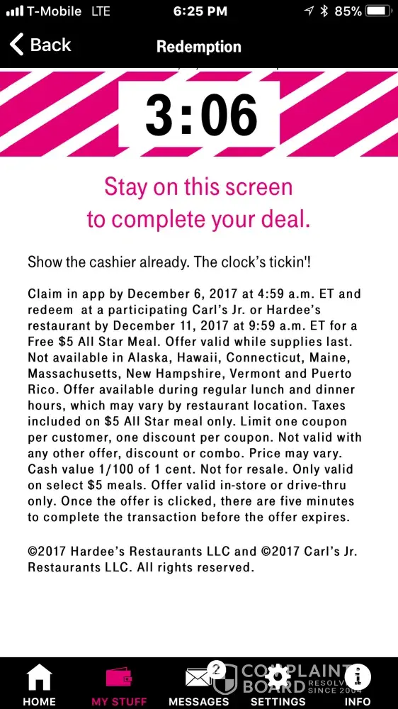 We meaning my family have t mobile and we went in to use or free meal at which time they refused to honor them at which time she said we have and email that we only honor on it on Tuesday and I replied the coupon says it's good till the 11th where they preceded to say it's good every Monday in December then I preceded to say is not good after next Monday but the manager of duty couldn't seem to get the jest of what we was saying so I told him I will contact the corporation and hung up so is this how you do business all I'm saying is don't offer up promotions if you're not going to honor them that's wrong you need obviously to teach them how to do business or not be a manager I'm just basically saying don't do t mobile deals if you don't want to stand good for it in so upset with Hardee's I don't know if I will patron them again and I prefer them over Mc Donalds but at least they will fix wrongs that you're managers didnt.