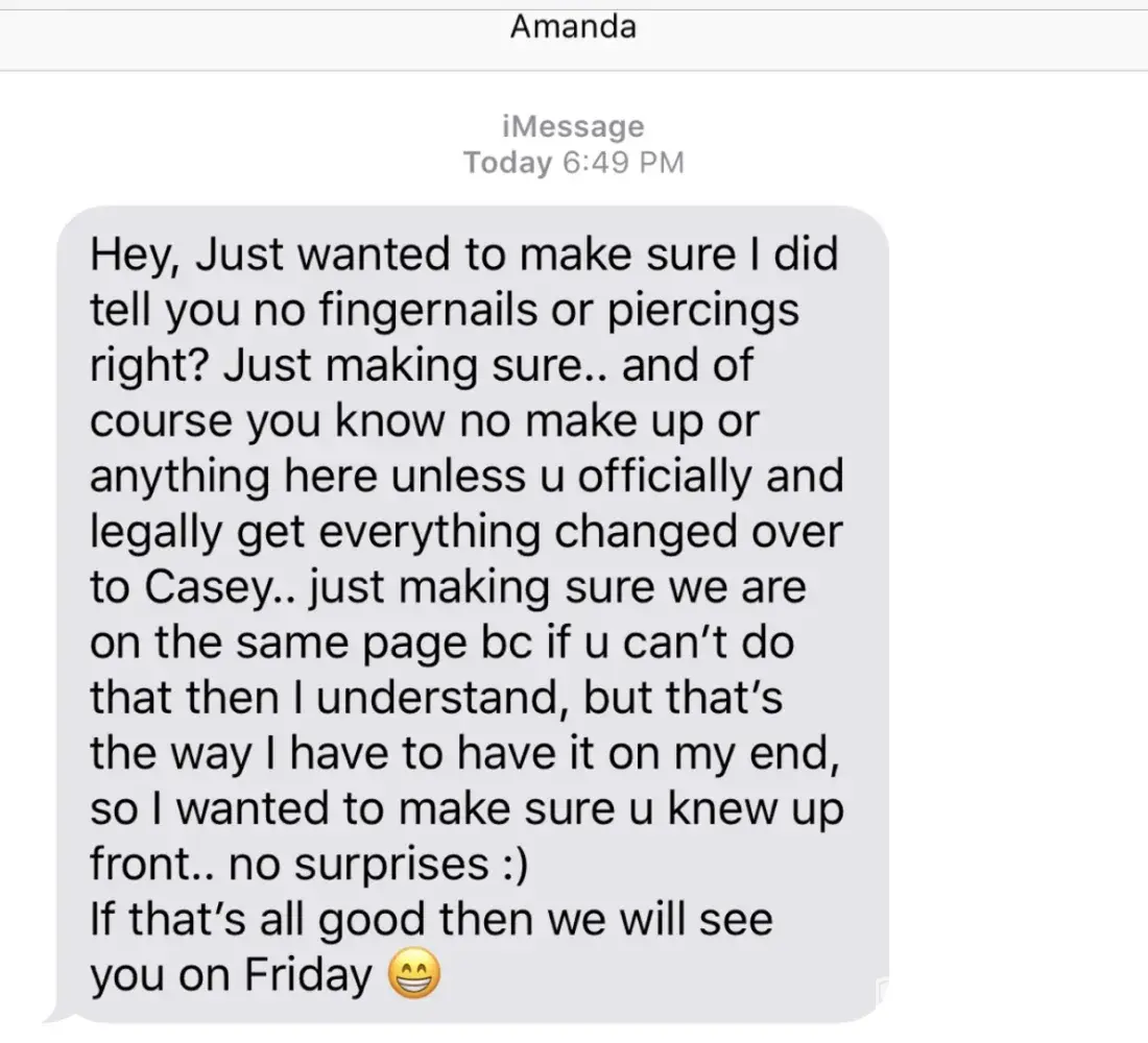 I am so concerned about a manager Amanda Jones, she has recently given my child a job, Dalton Turbyfill she goes by Kacee now, my child is transgender she has fought her whole life in a body she wasn't fit for and has finally started to live her life as she sees herself.I couldn't be more proud, days before she were to start she was sent a a text message from Amanda Jones that read she was not to dress as a woman no makeup no nails until she fully transitioned. I was not aware that Hardee's would discriminate against her and not allow her to be herself. This is like telling her to step back into the closet. I wasn't aware you have rules like this.I am so angry I am thinking of taking legal action.