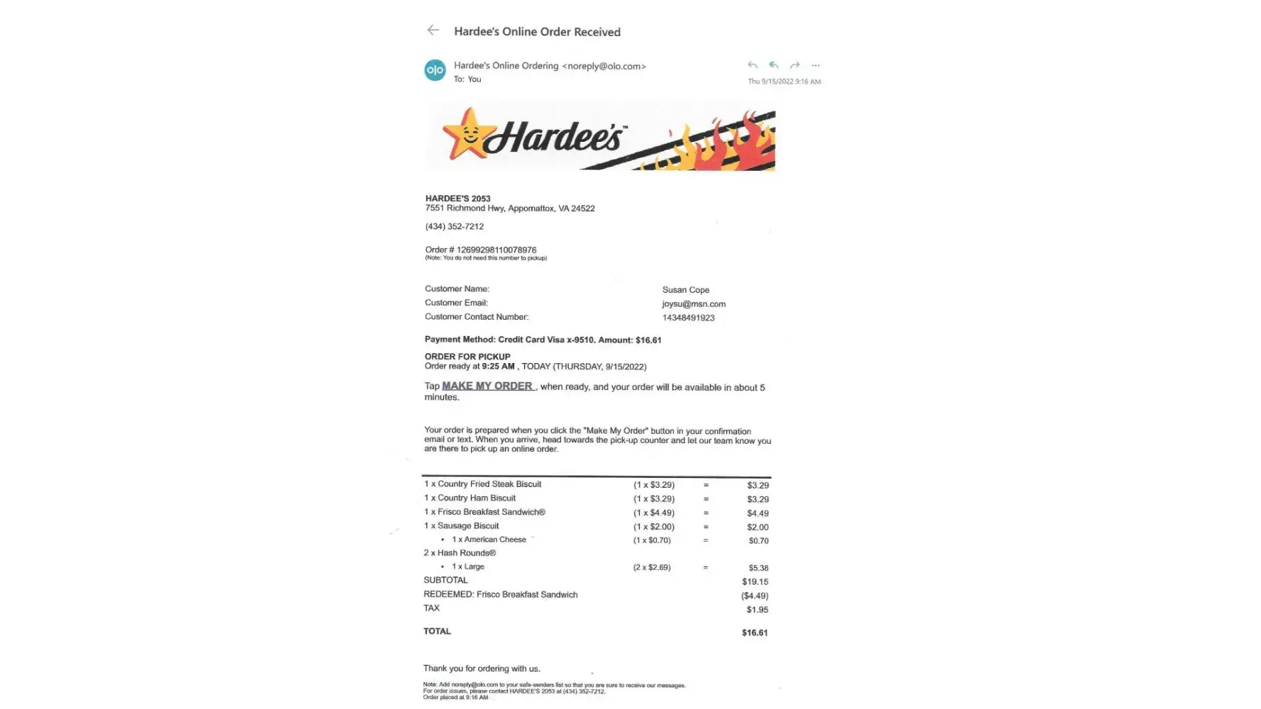 I placed an online order today, 9/15/22 at 9:16 a.m. at my local HARDEE'S 2053 7551 Richmond Hwy, Appomattox, VA 24522. I used 300 points for one item, Frisco Breakfast Sandwich, and then paid for the rest of my order which totaled $16.61. I received my confirmation email and clicked on the highlighted area MAKE MY ORDER just before I left to pick it up...