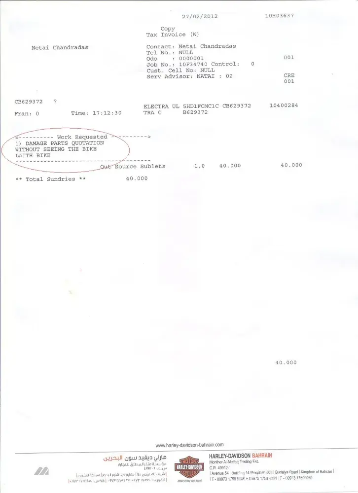 I am a Harley owner for long years, and recently I had an accident in Bahrain, and as per the insurance company I needed to get a quotation from the Harley Davidson Dealer in Bahrain as long as they do not acknowledge any other quotation, I went to the dealer and gave him the spare parts required and approved by the insurance company, they informed me that I have to pay BD 40 = USD 110 to give me the quotation even without inspecting the bike or seeing it.