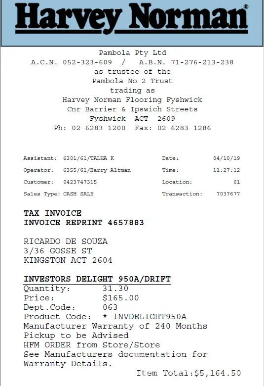 Harvey Normans inability to revolve this with a reasonable time frame is costing me money, as I cannot rent the place again with this problem. I must fix the floors before renting it out. Harvey Norman should at a minimum remove the faulty carpet ASAP leaving the site clean, or refund me the money I have paid.
