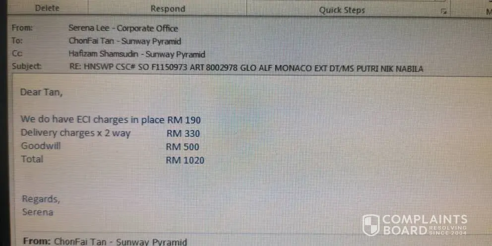 I purchased a dining table . Person in charged was Rizal (s.pyramid malaysia) convinced us it is real marble etc etc. However, However The table was ruined and peeled (to our surpised it wasnt a real marble). He later argue that it was because of water! I am sure by now you know your customers well, and no one would pour such heavy water on dining table! Then i Was asking for replacement till Mr Tan (cust servce department) contacted me regarding the matter. He also argued and refused to exchange it till i told him im gonna lodge a complaint to HN aussie. So Today he came up to me with ridiculous cost i need to bear for the exchange goods amounted to RM 1020! The reason being i have to bear for the delivery charges. And also GOODWILL (RM 500)! He attached an email from serena ( HN HQ malaysia regarding this ) i later asked what is goodwill the company is on about he told me its the dismantle and installation fees. Why the heck i have to bear the costing as much?! When it wasnt even caused from our end?! This is ridiculously stupid and unpractical!for the quality and poor service it is a ripped off price and i felt such as daylight robbery!