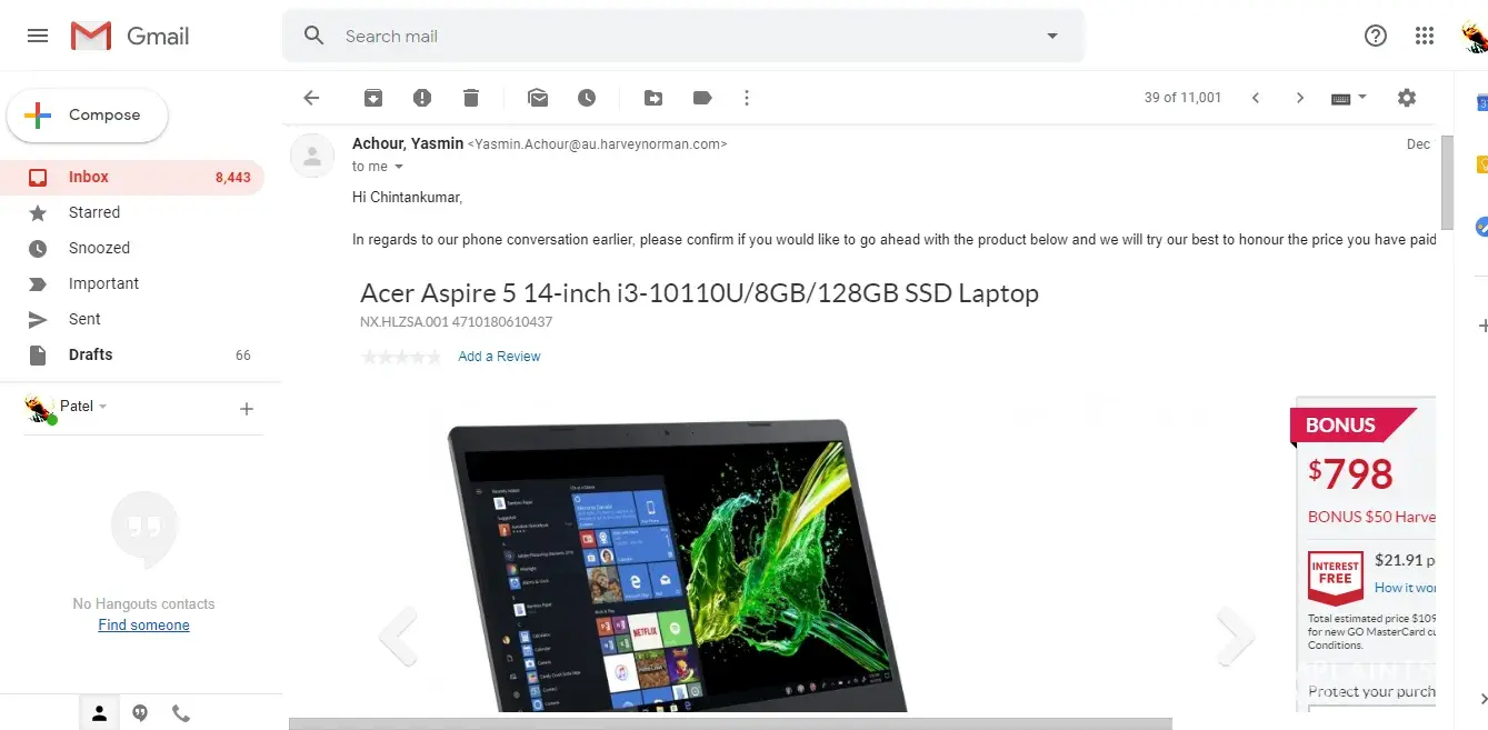 I bought a laptop on 29/11/2019 (Black Friday), then got my order confirmation. I have been waited for a week to get a further updates about my order. After a week I called online service team and they said order being process by Launceston Harvey Norman store so try to contact them. Called to store and they said try to contact online service team. This have had happened 3-4 days long as I mentioned. Then they said they do not have that laptop in stock now across Australia and do not have ETA (Expected Time of Arrival) as a result they offer me Refund but I decline it because I gave the reason, I bought that laptop for my personal use so refund is not an option for me. However, The next day they give me an alternate product option by looked at that alternate option (another laptop option) it is vast difference between which I ordered and one they offer an alternate. Moreover, I talked thair customer service representative team leader and I explained her all process and I gave them one alternate option which is same laptop as compare as I ordered but price is major concern, it is now on normal price and not in offer so she said she will contact upper management and contact with me, but till the date no positive answer from Harvey Norman (Online Services). Can you help me out in this situation because as I hone through they have been told everything different each day. I attached some proofs as I mentioned above. Please guide me and give me the right direction.