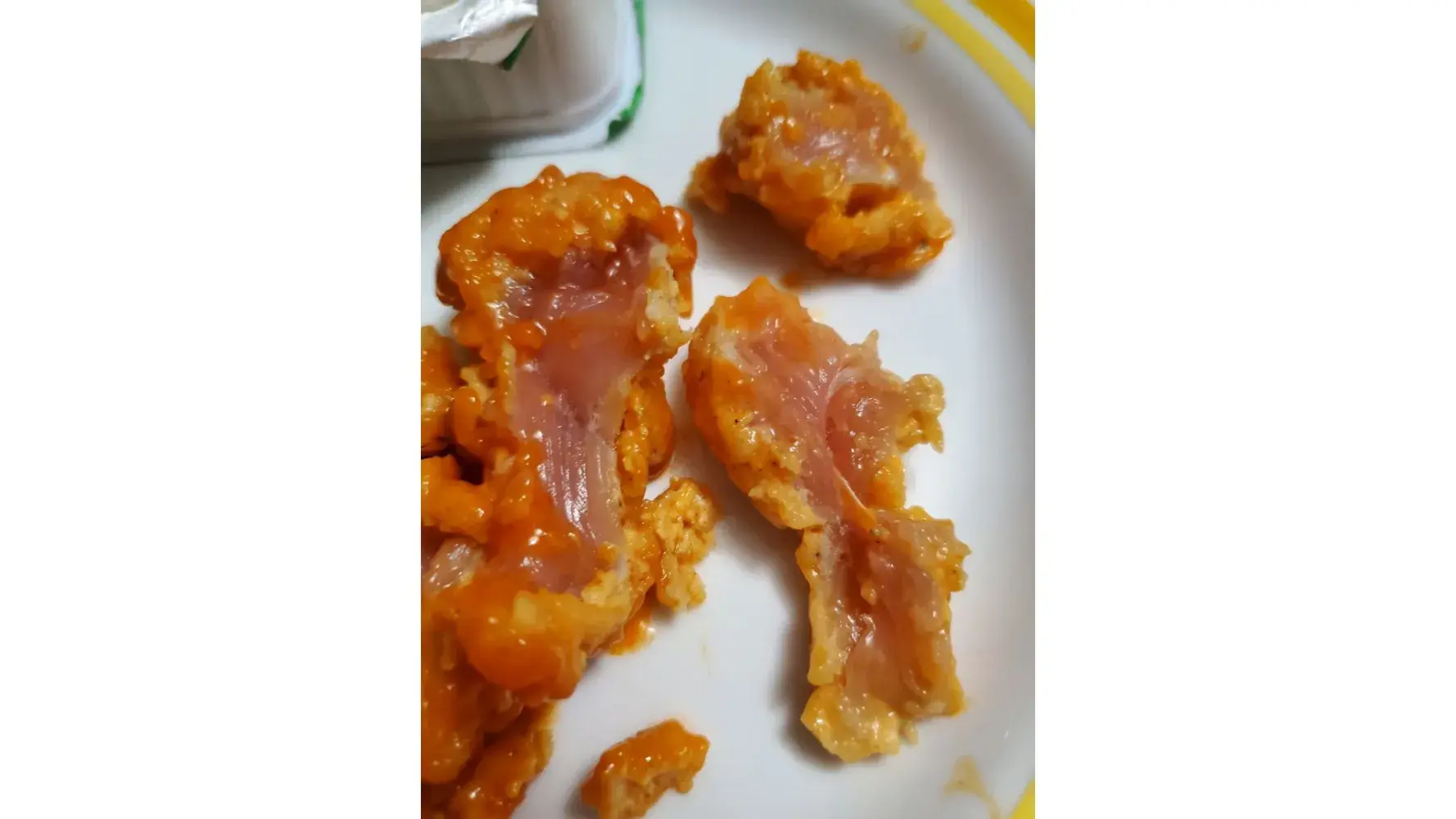 I took a bite. It was grotesquely chewy and tasted funny. I noticed when I picked the piece up that the batter was unusually Sloppy. I thought they included extra sauce and that was why it was soggy. I finished the piece, thinking I must have had a bad piece of chicken- the kind with gristle in it. I tried a second piece. Same sensation, maybe worse. I hastily swallowed that and chased it with a drink and then, puzzled, I took a third and ripped it open. To my ABSOLUTE shock and horror, the chicken was RAW. I am not taking about partially cooked. It was 100% raw all the way through. I have NEVER in my life received dangerous food before.