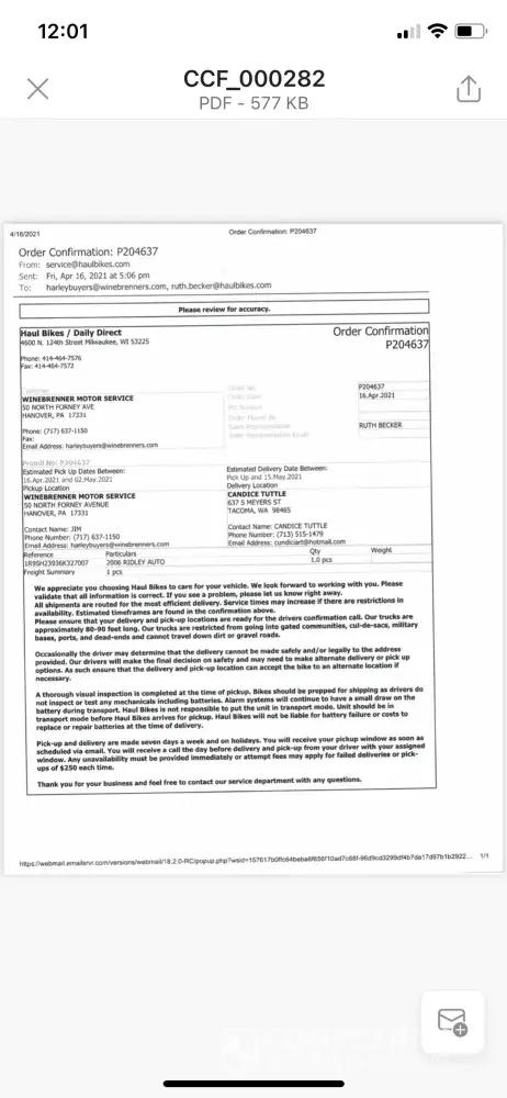 The sale went like clockwork and am very happy with the purchase and have not even seen the bike except in pictures. The problem is the company contracted by me to transport the new purchase. I contracted with them for 2 reasons. #1 is it was one of the shippers on the E-bay Site. I figured they had to be good if they were offering services on E-Bay. #2 I called Haul Bike after they Quoted the shipment to find out how long it would take to get the bike to me. I talked to Nancy who told me they had a truck close to the Area and was on the return leg to the warehouse in Wisconsin. I was told they had space on the truck and would be able to deliver in about a week after pick-up. I talked to the other services and they were all farther out due to shipments to and from bike week. Haul Bike wasn’t even the lowest quote. The quick delivery was most important to me. I don’t know about you but I have never purchased anything on the internet for more than $500.00 let alone spend close to $5000.00. I felt assured by using E-Bay. Long story short, I went with Haul Bikes. I was told the bike would be picked-up between 25-28 Feb 2011. When the bike was picked up Haul Bike did not call and tell me they had it. The seller called me and told me. I contacted Haul Bikes to find out a ETA on delivery and to offer a secondary drop location if they came through my area on the weekend. I was having the bike delivered to the warehouse I manage in St. Louis. I live in Illinois. I communicated with them to try to make the shipment as seamless to both parties as possible. I was told March 5-7. When the bike was not delivered on the 7th by 3pm I called on 3/8/11 to find out where it was. I was told by somebody Named Nancy that the Truck was broke down and they could not do anything about it. I was also told it would take another week and a half. Frustrated I hang up with her and waited until 3/17/11 to contact them again. I get Nancy on the phone and she tells me she doesn’t know anything about a broken down truck. Then she told me that the driver forgot that my bike was a pick-up and delivery. So he loaded 20 more bikes on to the truck and could not get mine off when it came time to deliver. But here is what really annoys me. I don’t like being lied to. I am strait up with everyone I deal with. I know that they had a truck probably headed south, and it swung by and loaded my bike, But where do you pick up 20 more bikes that quick. You go Further south and pick them up at bike week in Daytona. Then when you don’t deliver on what you say, you fall back on the contract and tell the customer that the contract states 2-3 weeks for delivery. I called Hual Bikes on 3/17/11. I asked where my bike was. I was told By Nancy that my Bike is in the warehouse in Wisconsin, Because the driver screwed up. I was also told that I would not get the bike until sometime the week of the 21st., I was told by Sharon they had a couple of deliveries on the way and I could not get any refund until the bike was delivered.