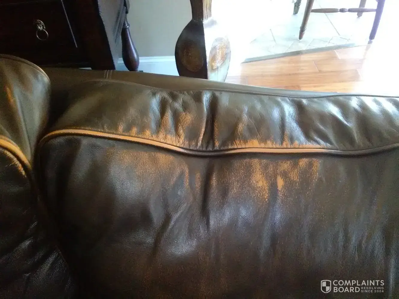The table is flaking. It hasn’t been scratched nor have any solvents been spilled on the table. I specifically bought the couch and chairs because they were firm cushions