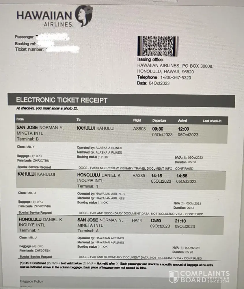We booked the above flights via Hawaiian Airlines, but 2 hours after we checked in on Wed, Oct 4th, we received an urgent flight change notification from HA that our flight from SJC --> OGG had been canceled and a rep from HA would contact us re flight details. We found out they changed the carrier from HA to Alaska Air and asked that we contact Alaska Air to check in for the next day flight without providing the correct Alaska booking confirmation. We scrambled to contact AA to check in hopes that we can be seated together since we took the time to check into the original flight HA 45 and had two seats right next to each other. Since the check-in was a bit late, all the seats were filled except for one in front of the other. Additionally, we thought AA would offer a hot lunch on this flight, but apparently, they only offered only a small snack and drink. Finally, the other issue was on our flight back from HNL to SJC on 10/9, there was a delay of an hour and 20 minutes. Thus, was quite inconvenient as we had to postpone the pickup time with a relative where they had to reschedule their late-night work call to pick us up later.