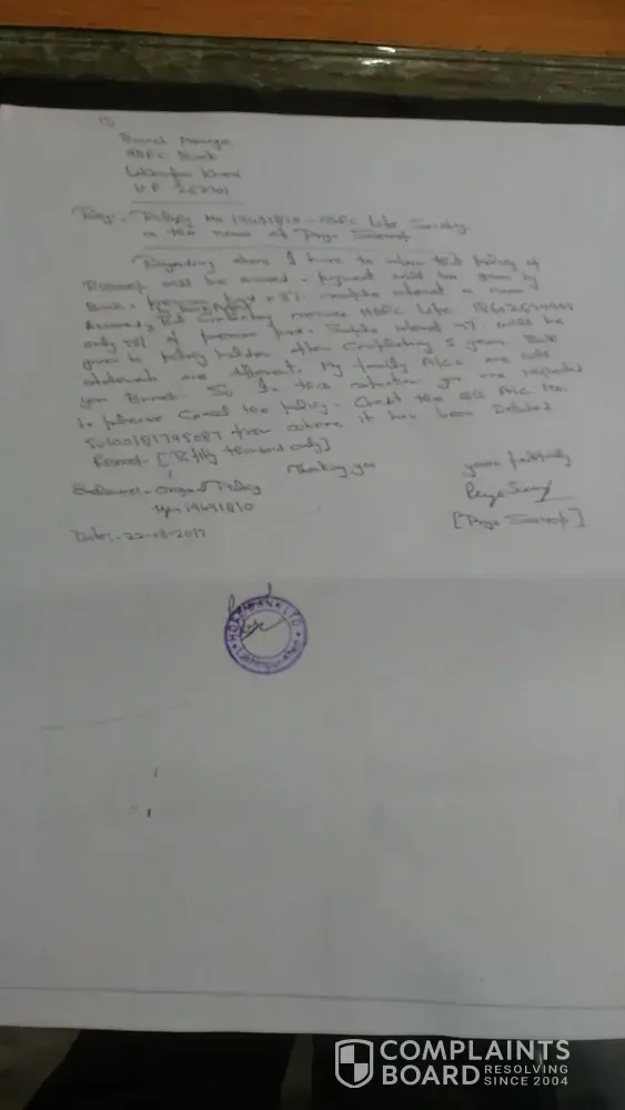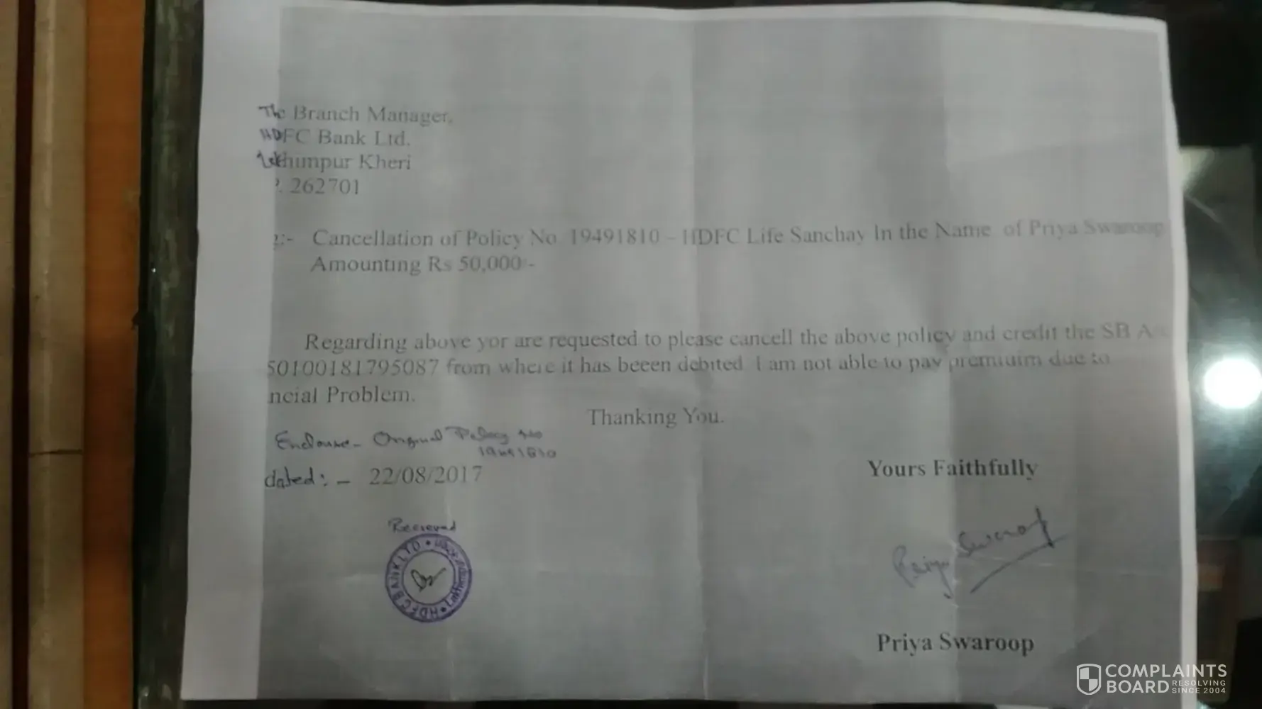 I am maintain A/C No [protected] in the name of Priya Swaroop in the Branch HDFC Lakhimpur Kheri Sri Amish Agarwal Branch Manager & Sri Sunil Kumar Mishra P B Manager came to my house for deposit and said if you deposit Rs50000/ per year for 5 Years you will get Rs250000/ & plus intt 8%, when I received the policy and contacted to customer care they said only 50%of the deposit amount, then I rushed to Branch and given letter along with original policy for cancellation on 22-08-2017, policy received on 09-08-2017, within 15 days from the receipt of policy, which is written in the policy, many times I contacted to Sri Amish Agarwal Branch Manager, he said payment will be credited within a week time I also contacted to Head HDFC Life Lucknow Sri Pankaj Kumar & mailed to care service Hdfc life on 25-10-2017 thrice & on 30-10-2017 twice & on 31-10-2017& also mailed to chair person Hdfc bank, Managing Director But two month &10 days have passed but no result
