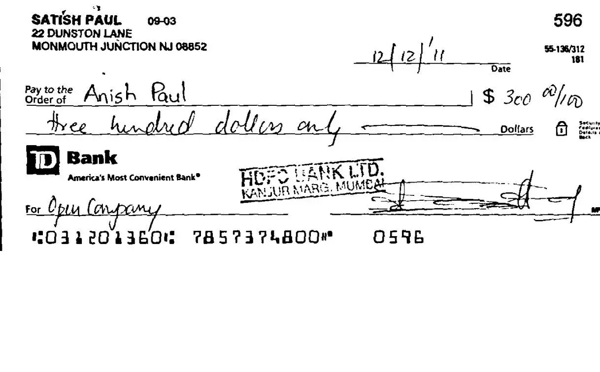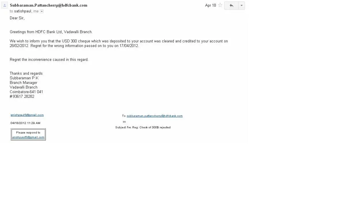 Knowing this situation, I had e-mailed by brother on 17/4/2012 to re-present the 300$ cheque.I came to know from my brother that the 300$ cheque was already cleared on February 7, 2012 at Kanjur Marg, Mumbai.I am attaching the cheque for your reference.