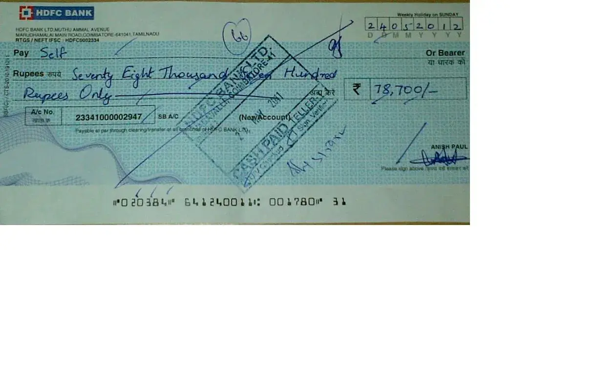 I had presented a Self cheque of Rs78, 700 on 24/5/2012.But I was refused to receive the amount as I had insufficient balance to be withdrawn.I am attaching the cheque for your reference.