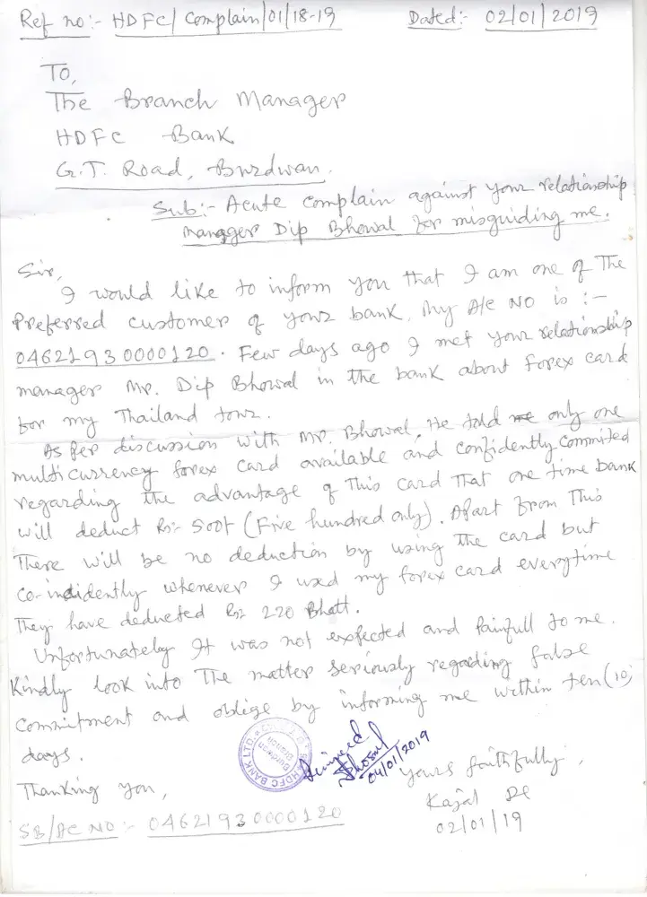 As per ref.no:-HDFC/Complain/01/18-19, dated:02/01/19 I have given a complain letter to the Branch Manager of HDFC Bank, G.T.Road, Burdwan, W.B. accordingly after Verbal discussion with him & he has committed me within seven days he will give me the details information.