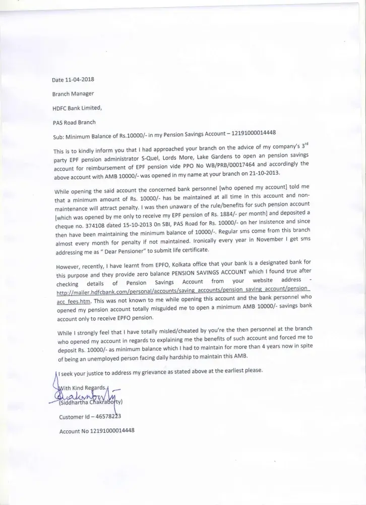 But Branch Manager after simply saying sorry, asked me to open a separate pension account and did not even taken my complain application. After that i felt that the Branch Manager did not show any concern for such aggreived customer as it appears he is more interested to keep me as 10000/- minimum balance customer.