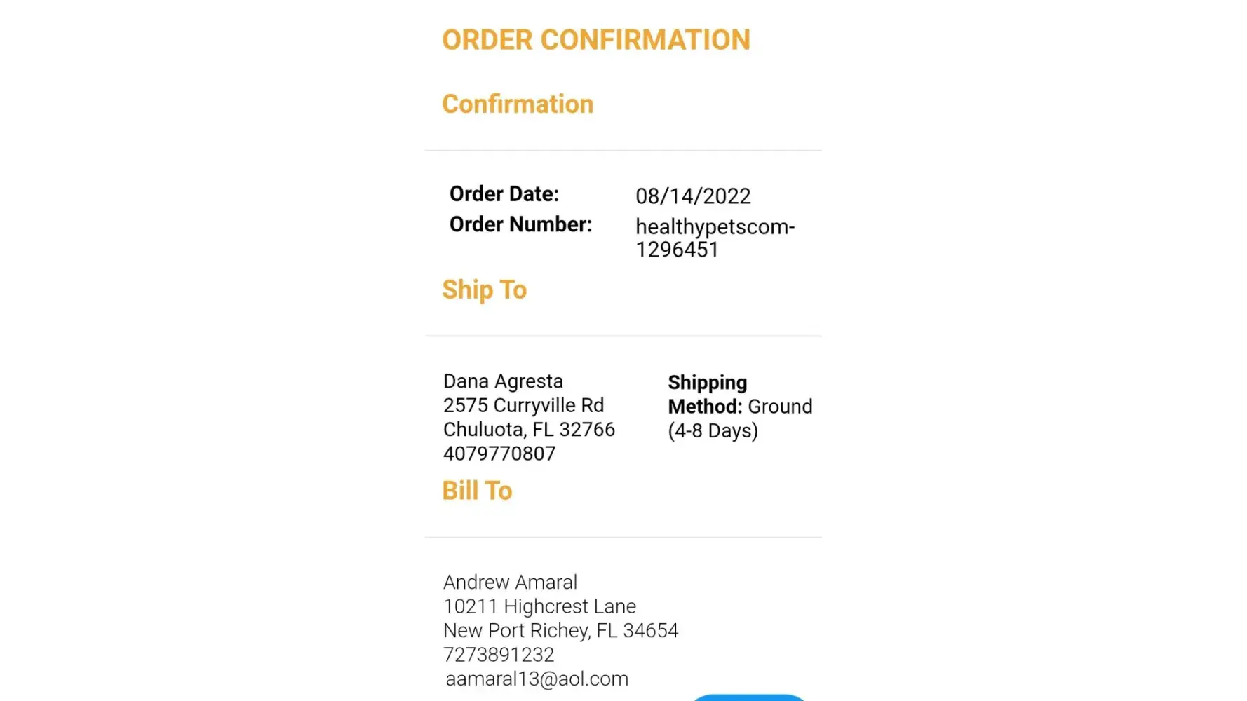 Order ID: 1183842 (indicated in healthypets.com order record)