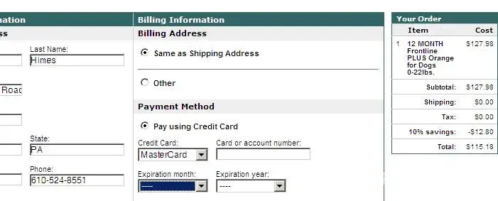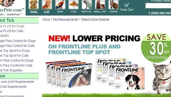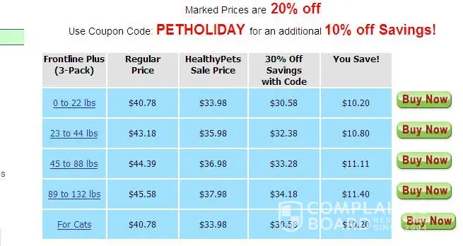 The e-mail sent to me advertised “SAVE 30% OFF Total Savings” for Frontline Plus. Above the prices shown for Frontline Plus 3-Pack, the website advertised “Marked Prices are 20% off” and below “Use coupon code PETHOLIDAY for an additional 10% off Savings!”, but the prices shown for the “HealthyPets Sale Price” was discounted 16.67% and the “30% off Savings with Code” price was discounted only 25%.