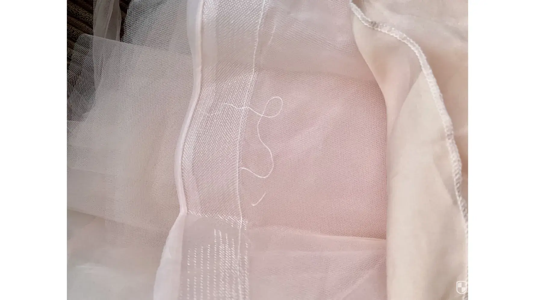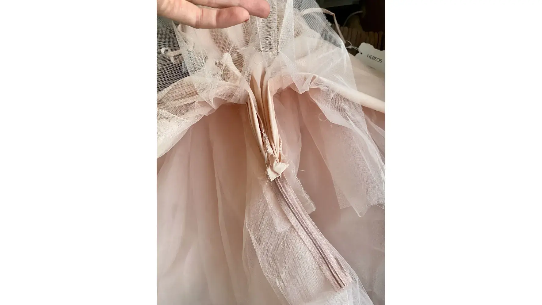 The dress is uneven and there are various areas with pieces of fabric being ripped or not stitched.
