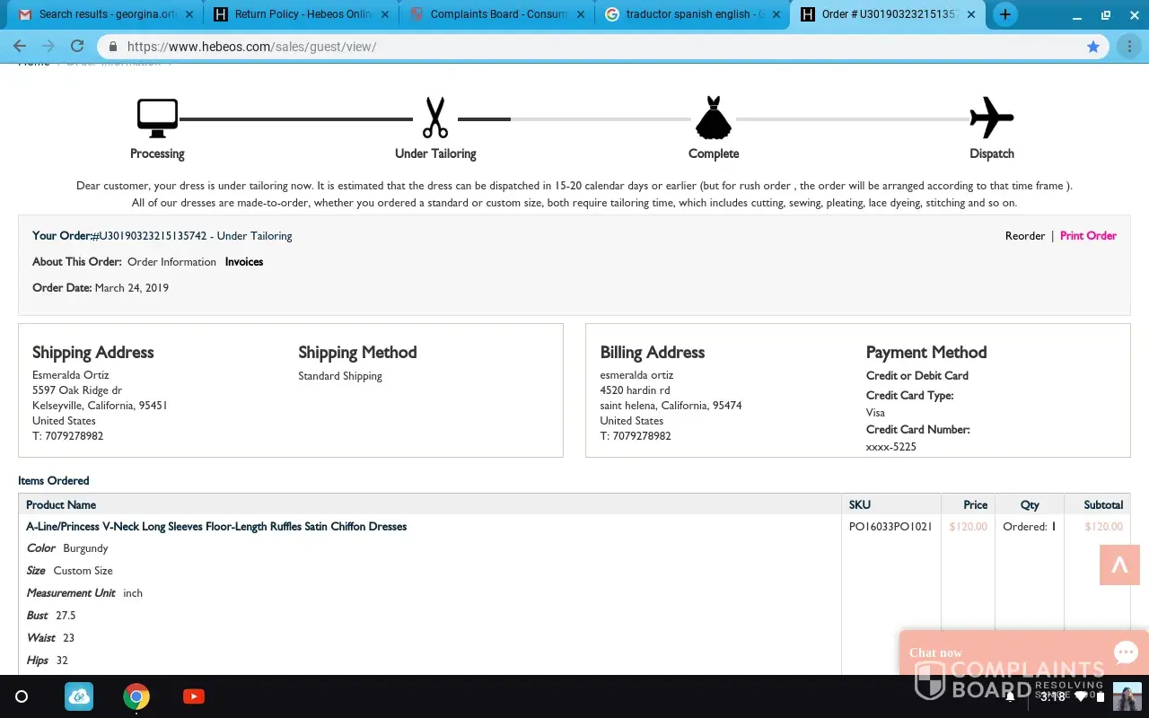 I ordered a dress from Hebeos on 25/04/19 and paid for expedited shipping, the dress arrived later than expected. I ordered a size 8 which my measurements were an exact fit for, however, when it arrived it was too big for me and the material had a shiny effect to it that was nothing like the image on the website. I have been in contact with the customer services team who are quite simply trying anything to avoid giving me a return address. They have requested that I send them photos of the product which I have, then they cheekily asked me for 'actual' measurements! I have responded to this email also, stating my measurements are exact to what their size chart shows for a UK 8 (the size I ordered). The website states 'worry free returns' clearly not the case! All I would like is an address to return it to so I can get a refund!