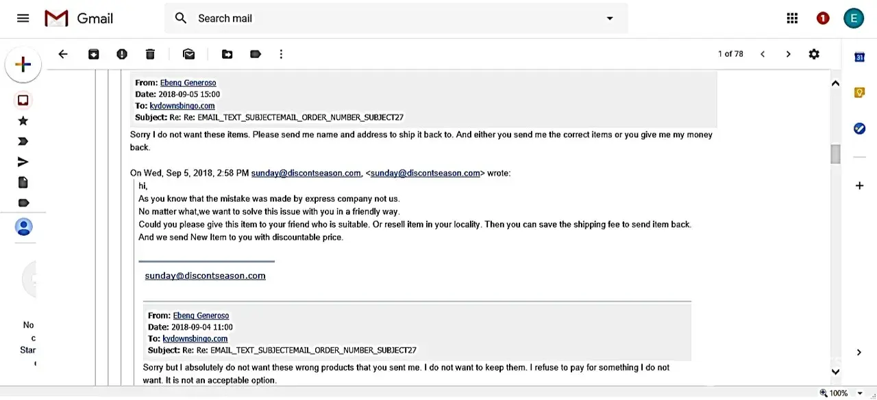 This website comes up for HerRoom bras and lingerie. I ordered and paid for 2 bras and got confirmation email from [protected]@discontseason.com. After about 2 months I received 2 tacky bras. I made contact through email and eventually received email from discontseason blaming express company for mistake. That was one month ago. They refuse to send me an address to return the products to and insist that I keep or sell the wrong products I received. The last email I received said it was fault of express company and they want to solve this in friendly manner, but they still want me to keep the wrong products and refuse to give me the return address.