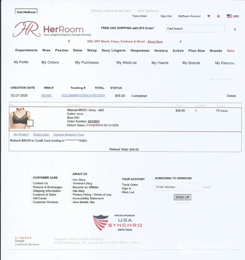 I returned a bra on February 27th. They processed an RMA 560481. The RMA was marked completed and the RMA claims the refund was issued to my credit card on [protected], but I have not yet received credit on my account. I have written emails to HerRoom Customer Service with no reply. The phone numbers are out of service. I know they had a problem with the Covid19 closure, but they are now back online advertising and selling again. I would like to get back the $56.00 still owe to me. I would greatly appreciate your assistance.