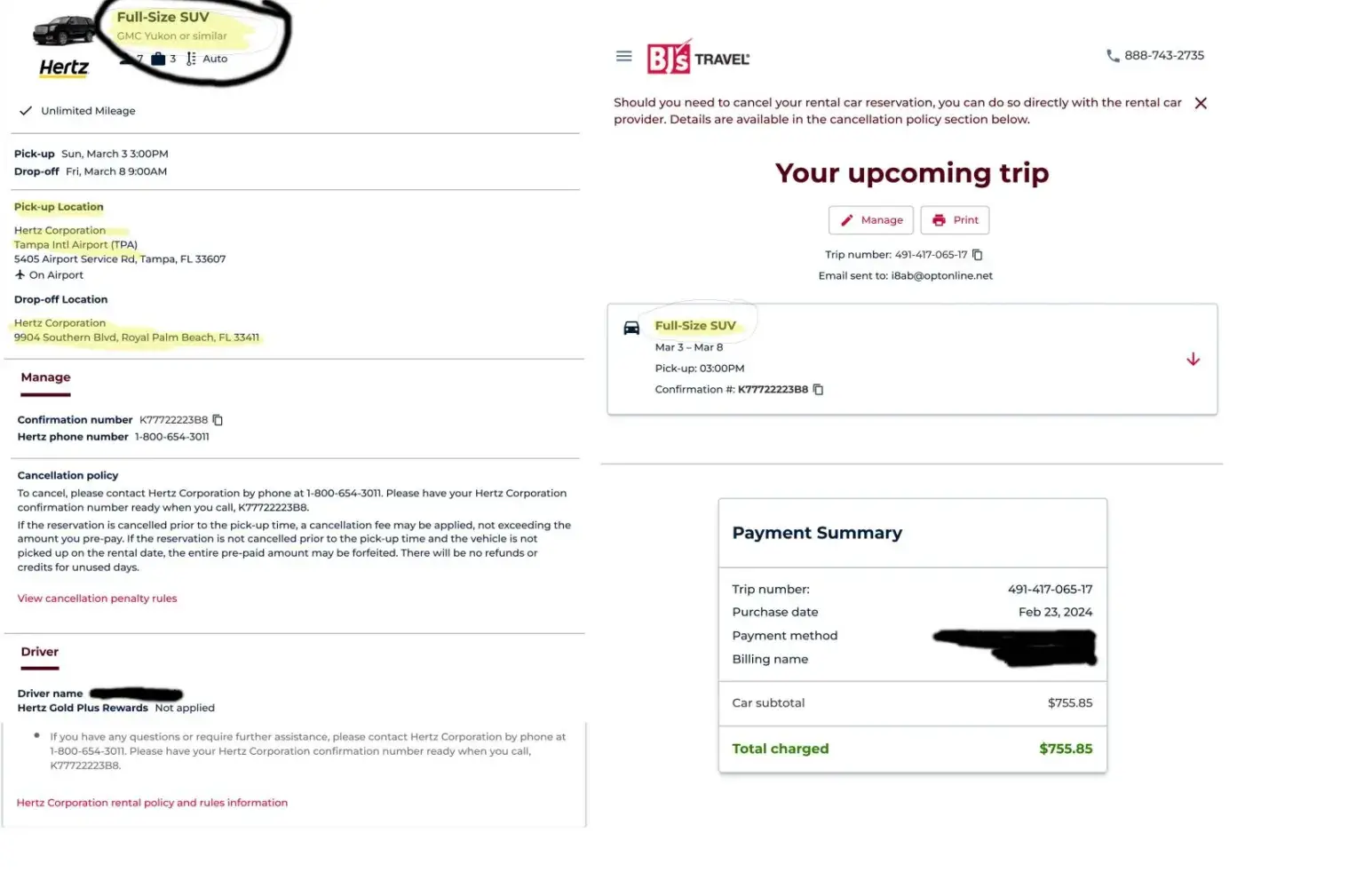 On February 23, 2024. I reserved a full-size SUV for Mar 3 - Mar 8, 2023 with a pick-up location Tampa International Airport and a drop-off location Hertz, Royal Palm Beach. Confirmation #K77722223B8.