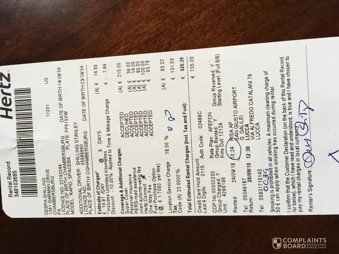 Hertz immediately charged our credit card $185.70 for being one day late! (We were less that 12 hrs. late according to contract.)