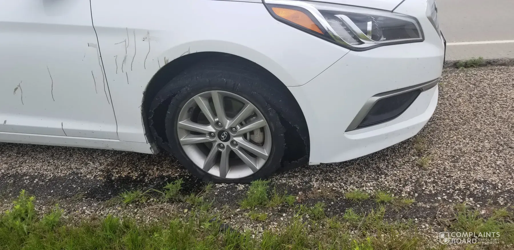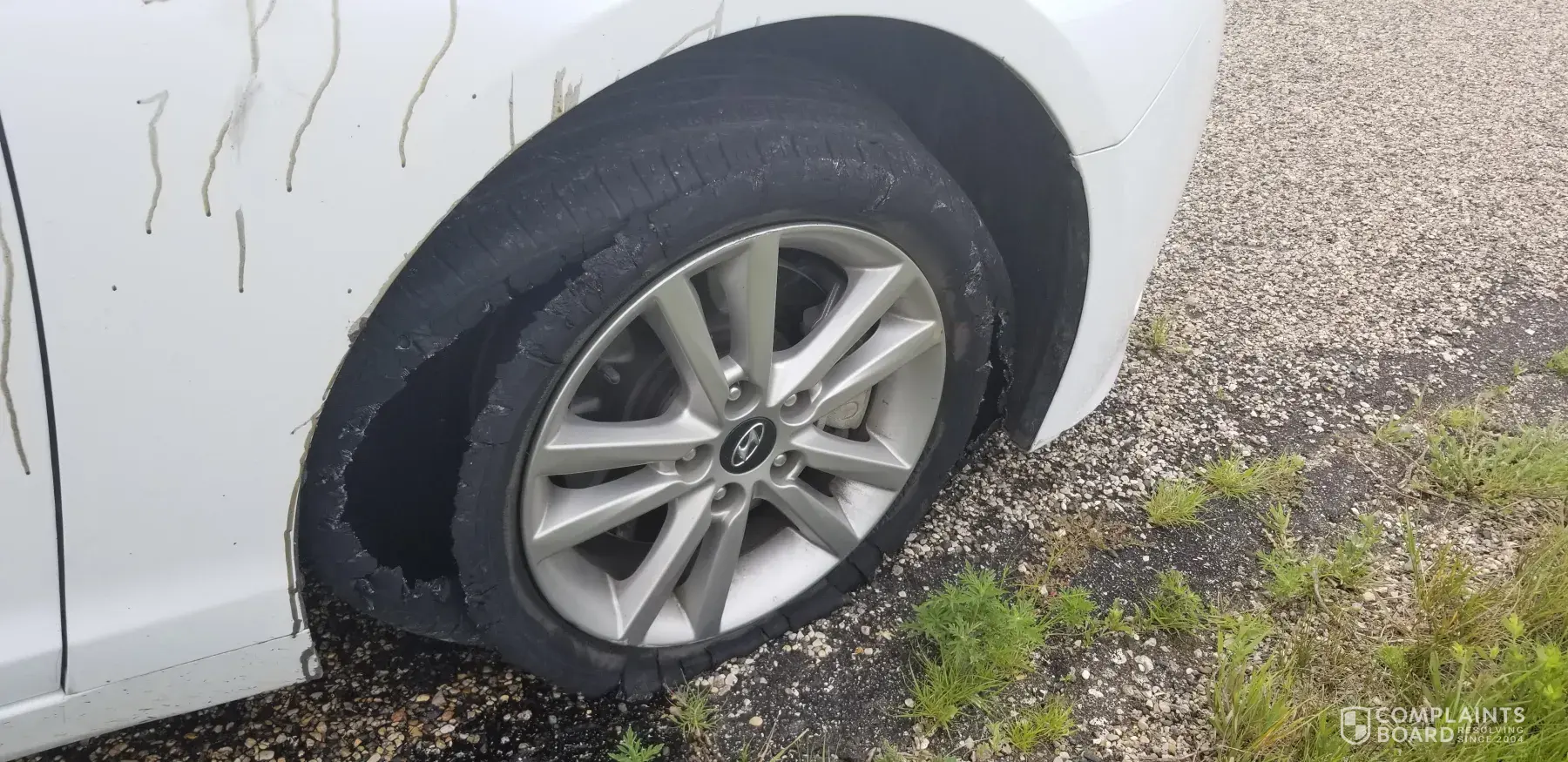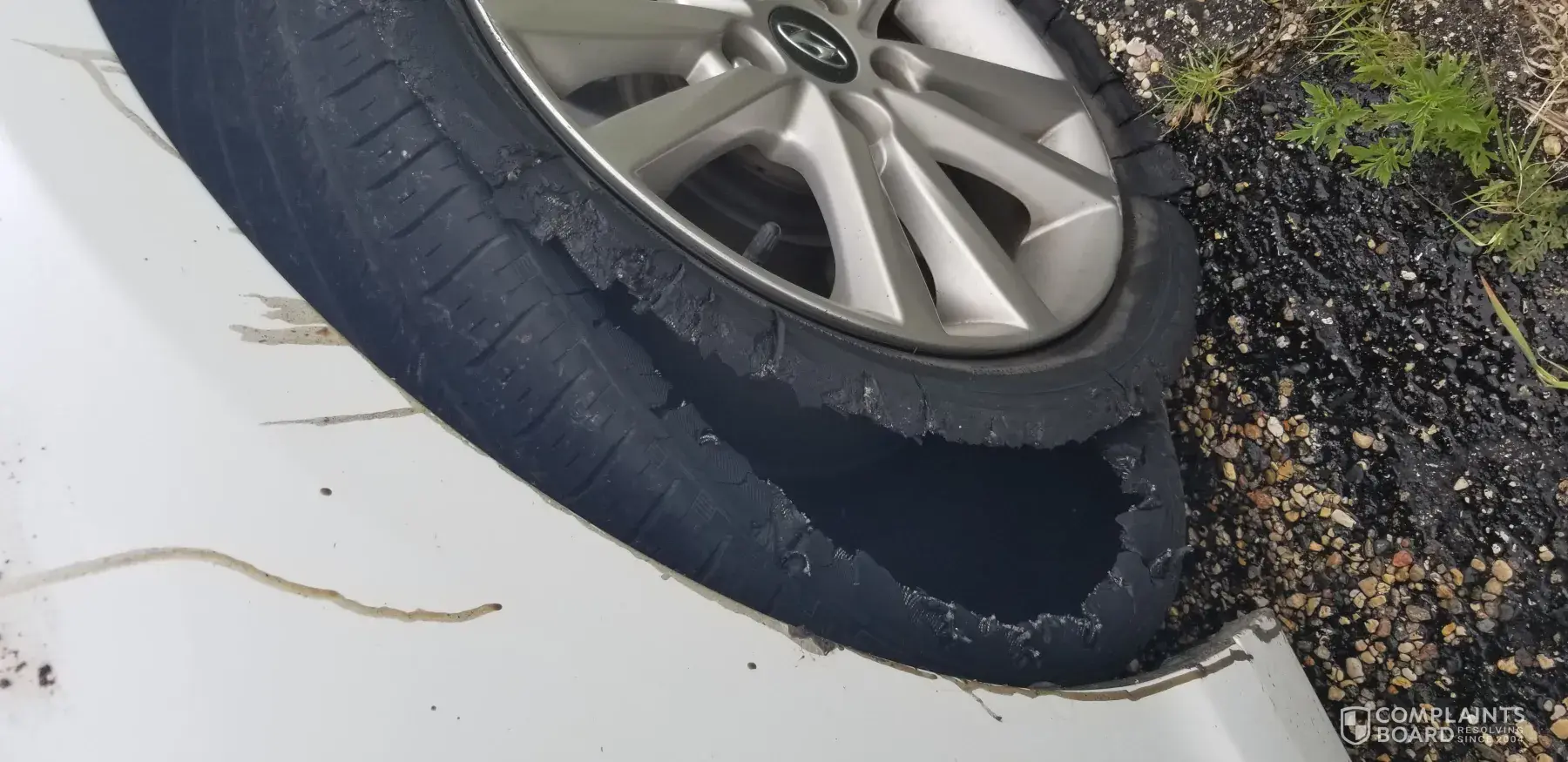 On 7/18 in the middle of Freeway, Tire was exploded as pictures attached. I called road side service and they told me it is my responsibility so I called Fargo location and they told me to call road side service. None of Hertz their did not even help me at all. Due to the reason, I called my AAA and towed the car to the nearest Hertz which is Aberdeen, SD Airport. That location was closed even it was like around 3 o'clock and won't open till Friday. I had to ask AAA to replace the spare tire but that spare tire was not able to drive more than 50 miles. Next closed Hertz location was Sioux Falls, SD airport which is about 150 miles away. AAA recommended me to replace to tire to get to Sioux Falls so I had to replace the tire. According to the condition of tire which was mounted to the car, I don't think it is my fault and deserve the reimburse for those cost. I attached invoices. I also returned original tire with the car so you Sioux Falls location must have it, too.
