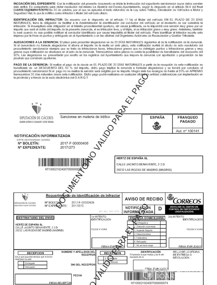 Contacting "[protected]@Hertz" I indicated that I was unaware of any traffic violation six months earlier, and requested documentation and evidence of the alleged violation. Their reply was simply to state that I was being charged the amount and enclosed a BLANK form entitled "Notificacion Informatizada" with no information about the alleged violation. The response from them had NO specific violation, NO car license number, NO location, NO time of day, and NO statute or law allegedly violated. In effect, it was a BLANK form.