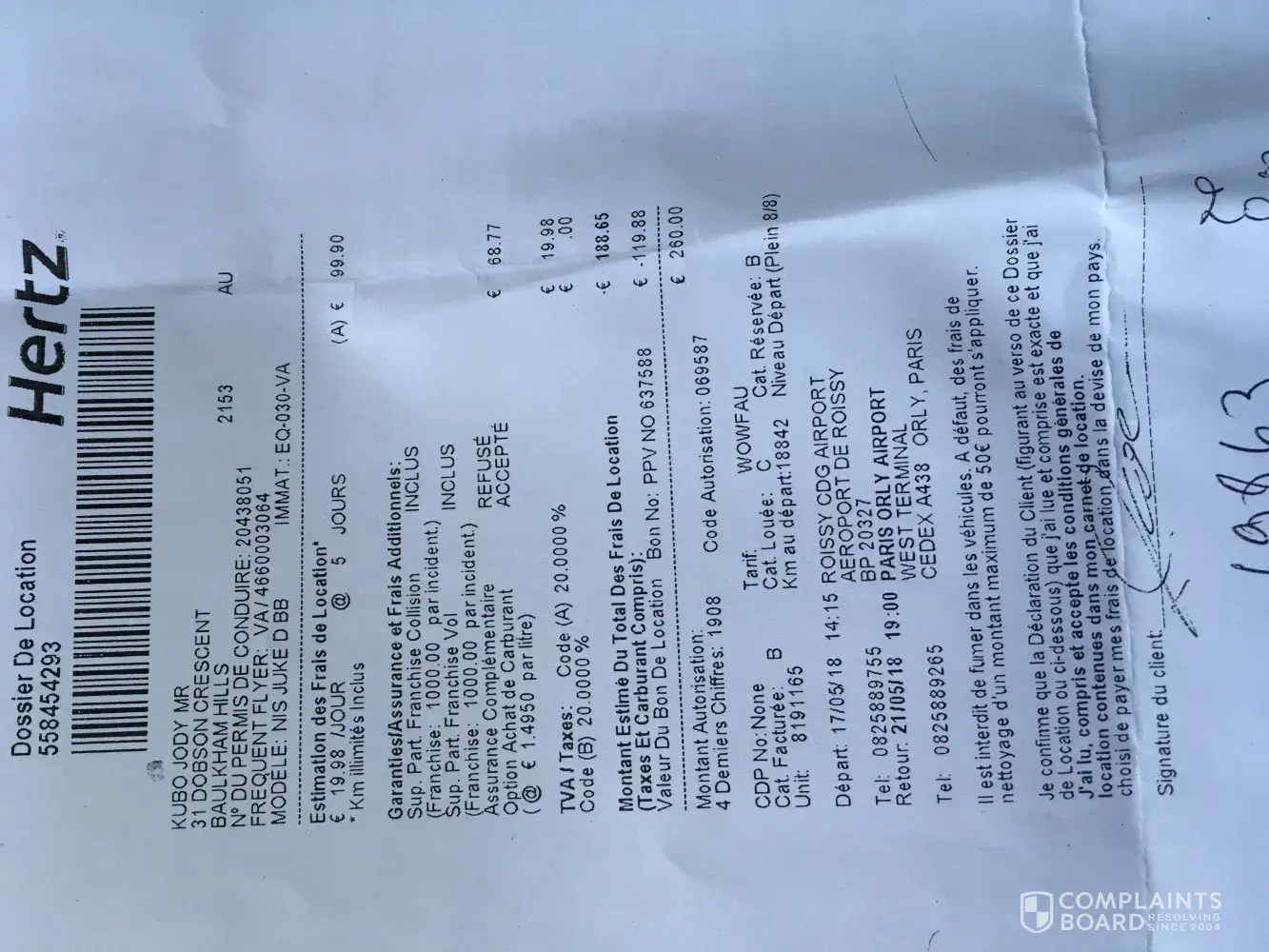 I was told I would get a receipt by email but it has yet to come. I went to Orly Airport Hertz to clear this up but was told to call customer service. I called their customer service number number, was sent to two service departments but both said I was at wrong dept. One operator hung up on me. The entire Hertz experience was terrible and it's still not over.