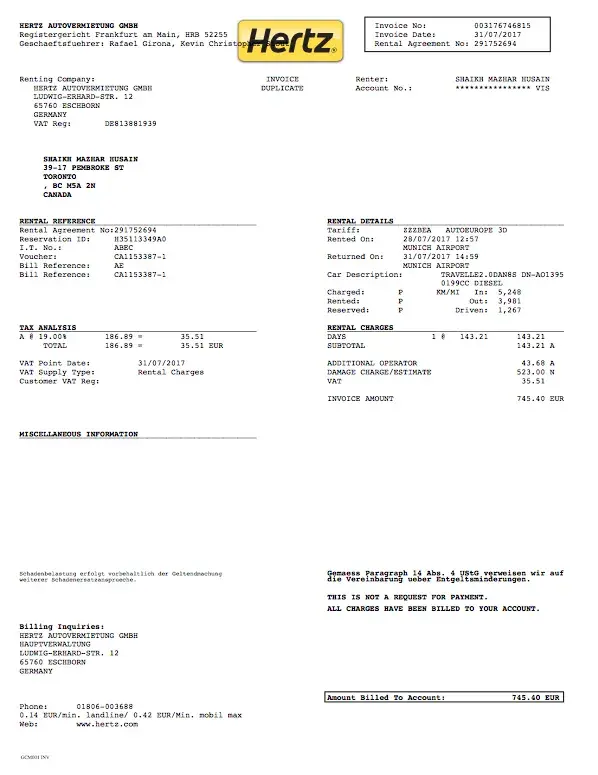 I rented a car from Hertz Munich Airport details below. I see an additional day charge on my invoice. I have sent 5 emails to Hertz to remove and refund OR explain this charge, but they have not replied to my satisfaction NOR have they even touched on the additional day charge and reason. They always reply and give info on everything except the additional charges.