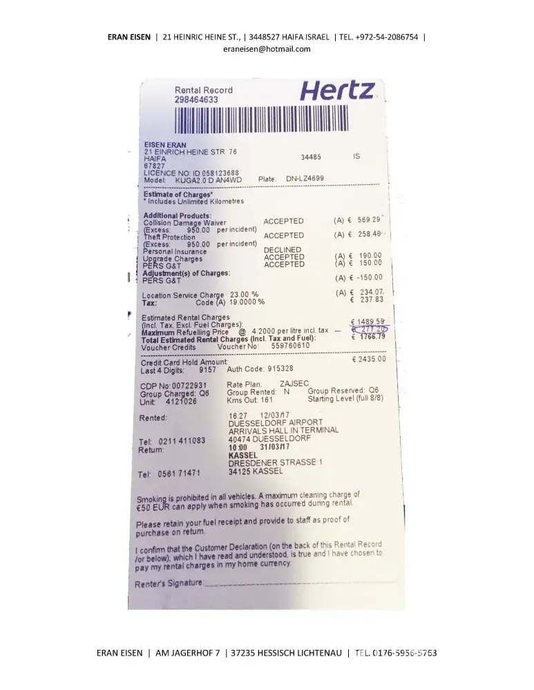 These 2 attached pages were sent to Hertz offices in Germany and UK on 3.4.2017 and never been answered. As a valuable customer, i find this kind of behavior extremely un respectful and insulting.